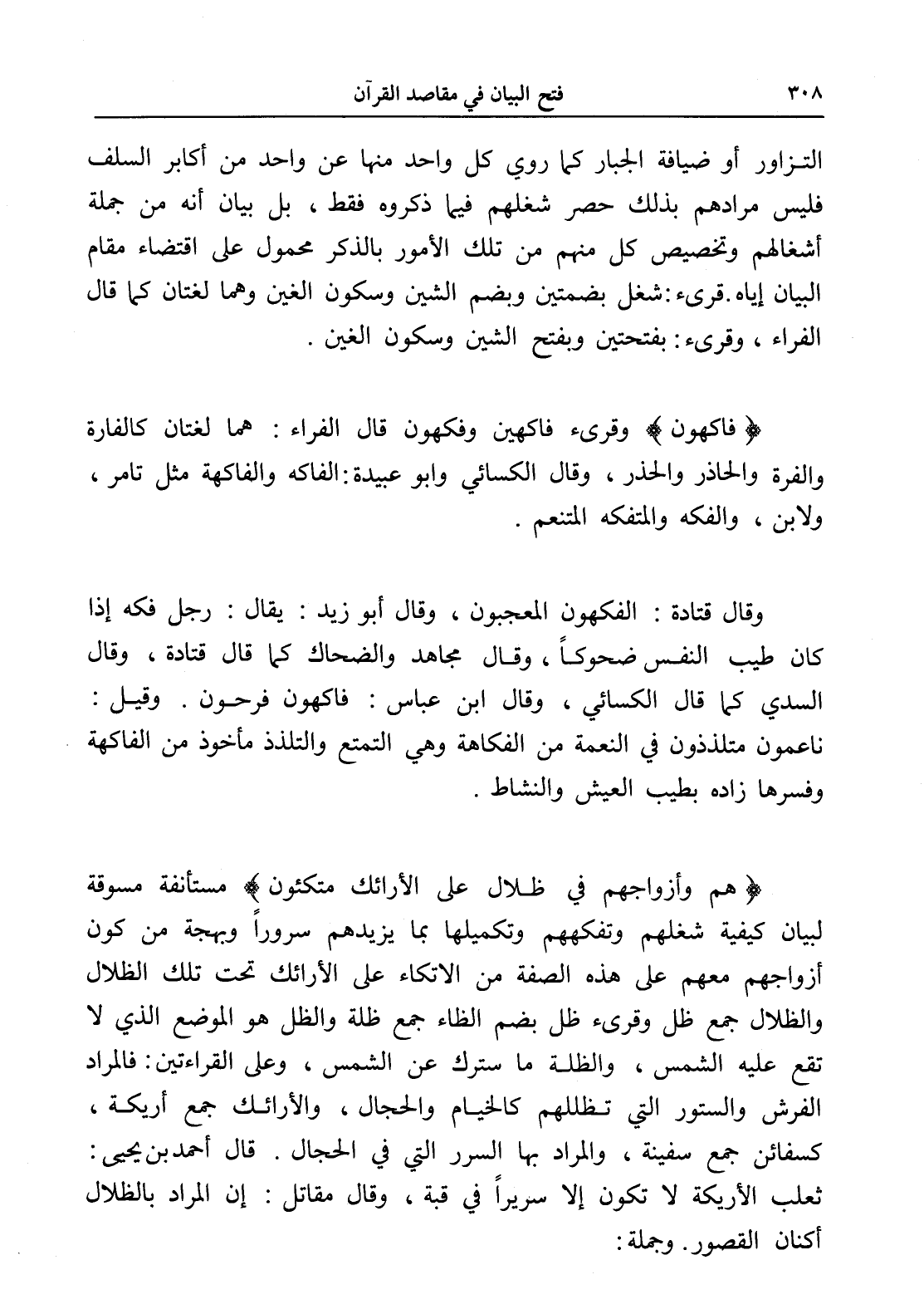 (فاكهون) وقرىء فاكهين وفكهون قال الفراء: هما لغتان كالفارة والفرة والحاذر والحذر، وقال الكسائي وأبو عبيدة: الفاكه والفاكهة مثل تامر، ولابن، والفكه والمتفكه المتنعم.