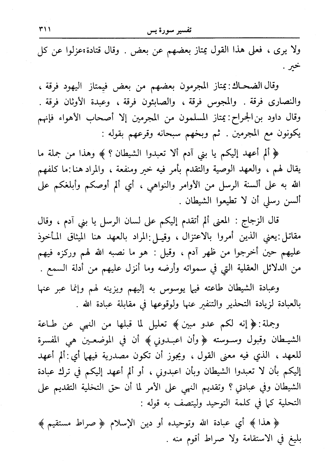 (ألم أعهد إليكم يا بني آدم ألا تعبدوا الشيطان)؟ وهذا من جملة ما يقال لهم، والعهد الوصية والتقدم بأمر فيه خير ومنفعة، والمراد هنا: ما كلفهم الله به على ألسنة الرسل من الأوامر والنواهي، أي ألم أوصكم وأبلغكم على ألسن رسلي أن لا تطيعوا الشيطان.