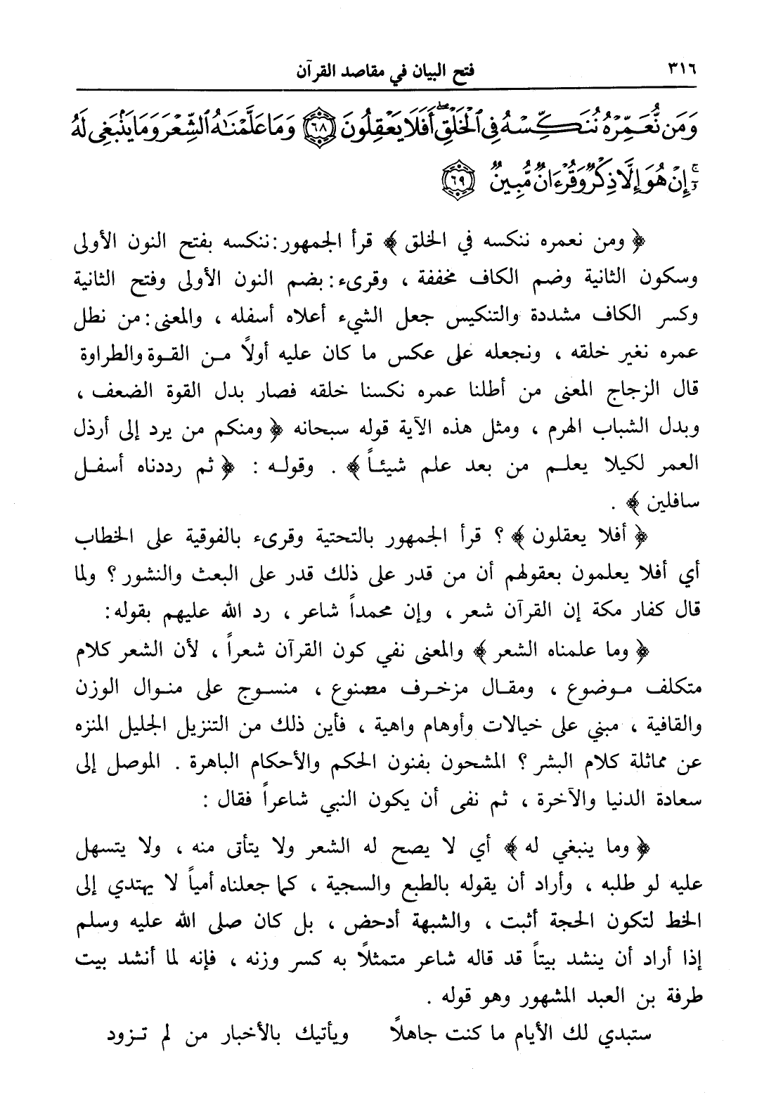 وَمَنْ نُعَمِّرْهُ نُنَكِّسْهُ فِي الْخَلْقِ أَفَلَا يَعْقِلُونَ (68) وَمَا عَلَّمْنَاهُ الشِّعْرَ وَمَا يَنْبَغِي لَهُ إِنْ هُوَ إِلَّا ذِكْرٌ وَقُرْآنٌ مُبِينٌ (69)