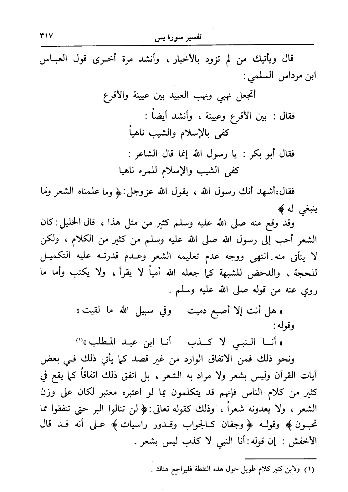 وقد وقع منه صلى الله عليه وسلم كثير من مثل هذا، قال الخليل: كان الشعر أحب إلى رسول الله صلى الله عليه وسلم من كثير من الكلام، ولكن لا يتأتى منه. انتهى ووجه عدم تعليمه الشعر وعدم قدرته عليه التكميل للحجة، والدحض للشبهة كما جعله الله أمياً لا يقرأ، ولا يكتب وأما ما روي عنه من قوله صلى الله عليه وسلم.