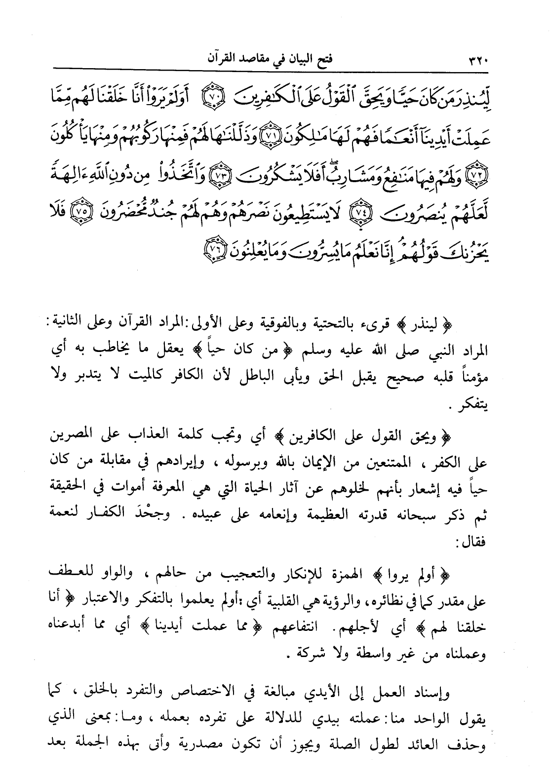 لِيُنْذِرَ مَنْ كَانَ حَيًّا وَيَحِقَّ الْقَوْلُ عَلَى الْكَافِرِينَ (70) أَوَلَمْ يَرَوْا أَنَّا خَلَقْنَا لَهُمْ مِمَّا عَمِلَتْ أَيْدِينَا أَنْعَامًا فَهُمْ لَهَا مَالِكُونَ (71) وَذَلَّلْنَاهَا لَهُمْ فَمِنْهَا رَكُوبُهُمْ وَمِنْهَا يَأْكُلُونَ (72) وَلَهُمْ فِيهَا مَنَافِعُ وَمَشَارِبُ أَفَلَا يَشْكُرُونَ (73) وَاتَّخَذُوا مِنْ دُونِ اللَّهِ آلِهَةً لَعَلَّهُمْ يُنْصَرُونَ (74) لَا يَسْتَطِيعُونَ نَصْرَهُمْ وَهُمْ لَهُمْ جُنْدٌ مُحْضَرُونَ (75) فَلَا يَحْزُنْكَ قَوْلُهُمْ إِنَّا نَعْلَمُ مَا يُسِرُّونَ وَمَا يُعْلِنُونَ (76)
