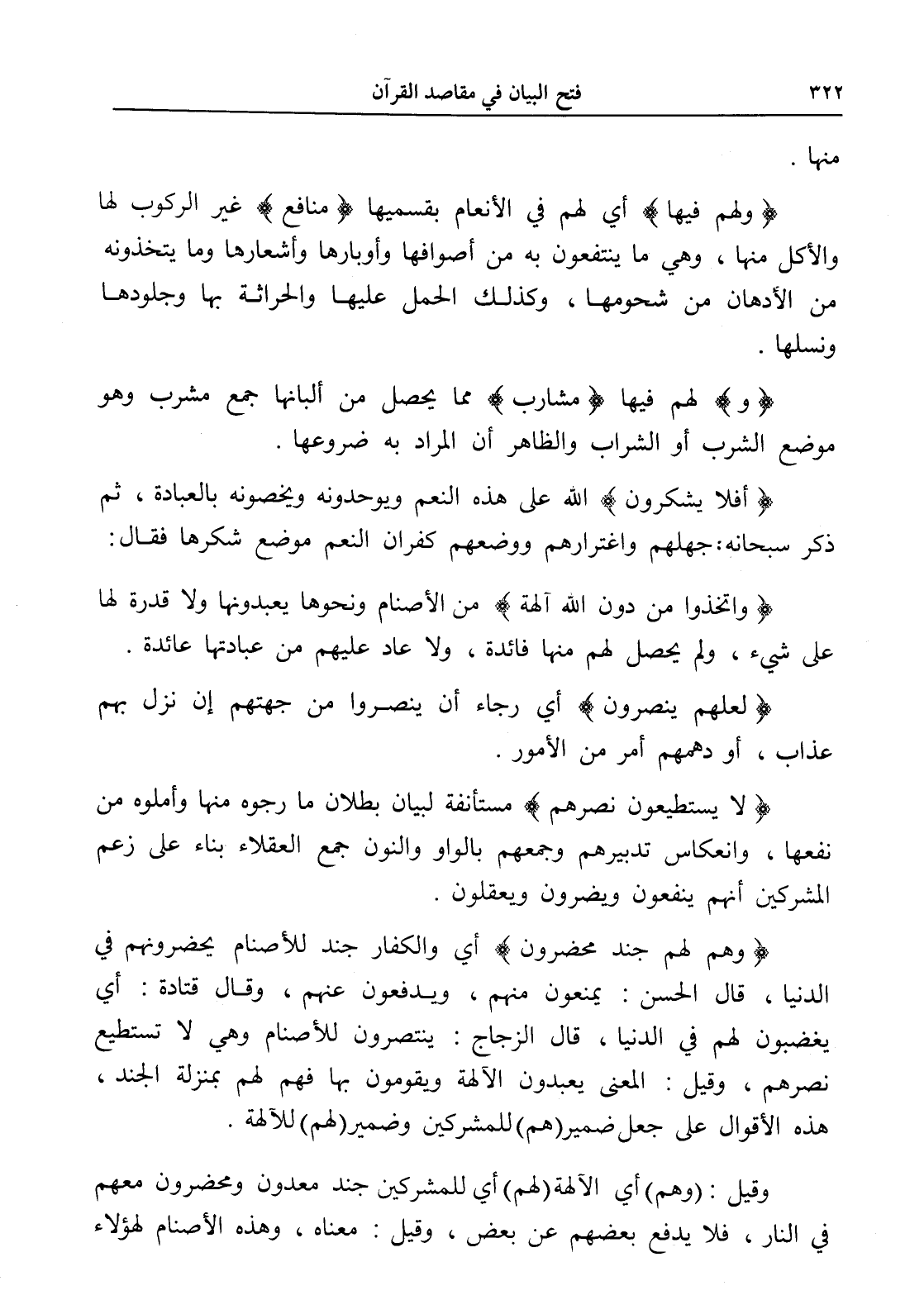 (ولهم فيها) أي لهم في الأنعام بقسميها (منافع) غير الركوب لها والأكل منها، وهي ما ينتفعون به من أصوافها وأوبارها وأشعارها وما يتخذونه من الأدهان من شحومها، وكذلك الحمل عليها والحراثة بها وجلودها ونسلها.
