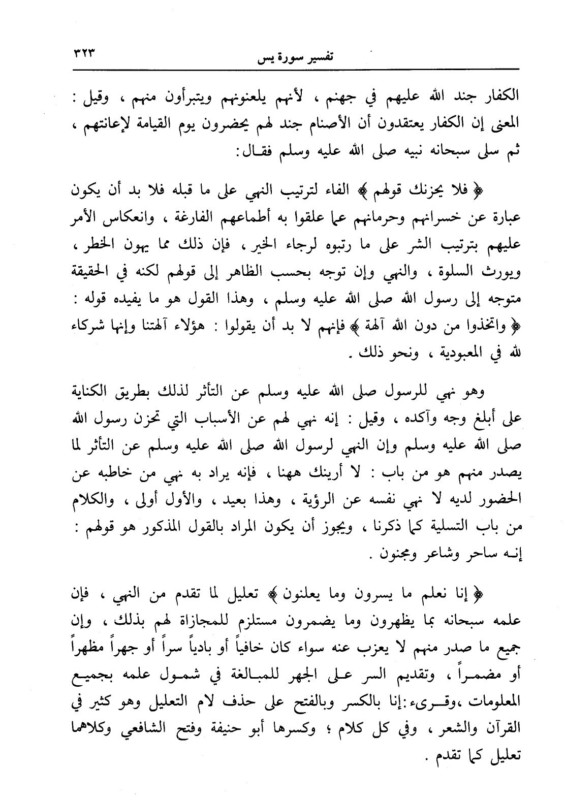 (إنا نعلم ما يسرون وما يعلنون) تعليل لما تقدم من النهي، فإن علمه سبحانه بما يظهرون وما يضمرون مستلزم للمجازاة لهم بذلك، وإن جميع ما صدر منهم لا يعزب عنه سواء كان خافياً أو بادياً سراً أو جهراً مظهراً أو مضمراً، وتقديم السر على الجهر للمبالغة في شمول علمه بجميع المعلومات، وقرىء: إنا بالكسر وبالفتح على حذف لام التعليل وهو كثير في القرآن والشعر، وفي كل كلام؛ وكسرها أبو حنيفة وفتح الشافعي وكلاهما تعليل كما تقدم.