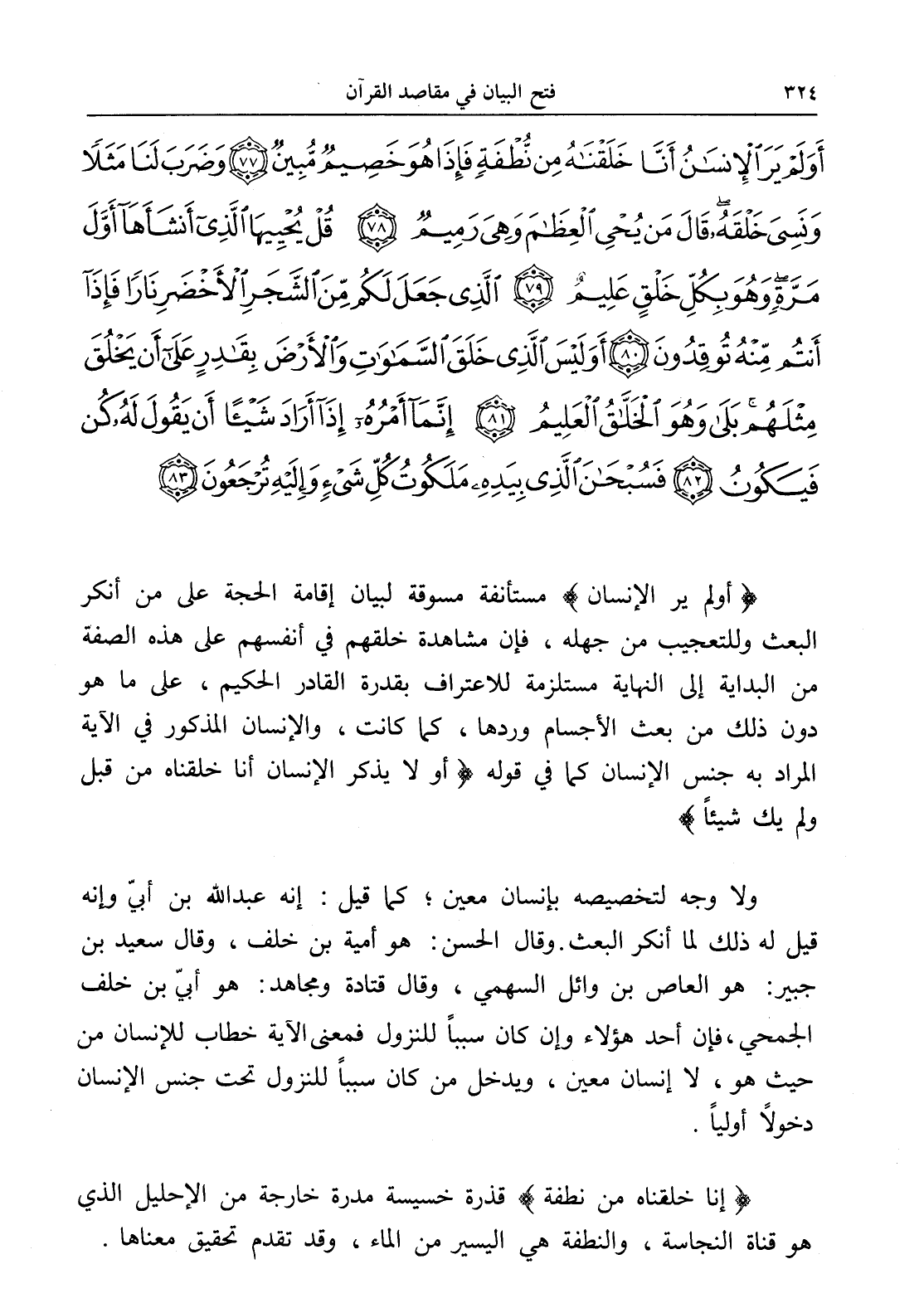 أَوَلَمْ يَرَ الْإِنْسَانُ أَنَّا خَلَقْنَاهُ مِنْ نُطْفَةٍ فَإِذَا هُوَ خَصِيمٌ مُبِينٌ (77) وَضَرَبَ لَنَا مَثَلًا وَنَسِيَ خَلْقَهُ قَالَ مَنْ يُحْيِ الْعِظَامَ وَهِيَ رَمِيمٌ (78) قُلْ يُحْيِيهَا الَّذِي أَنْشَأَهَا أَوَّلَ مَرَّةٍ وَهُوَ بِكُلِّ خَلْقٍ عَلِيمٌ (79) الَّذِي جَعَلَ لَكُمْ مِنَ الشَّجَرِ الْأَخْضَرِ نَارًا فَإِذَا أَنْتُمْ مِنْهُ تُوقِدُونَ (80) أَوَلَيْسَ الَّذِي خَلَقَ السَّمَاوَاتِ وَالْأَرْضَ بِقَادِرٍ عَلَى أَنْ يَخْلُقَ مِثْلَهُمْ بَلَى وَهُوَ الْخَلَّاقُ الْعَلِيمُ (81) إِنَّمَا أَمْرُهُ إِذَا أَرَادَ شَيْئًا أَنْ يَقُولَ لَهُ كُنْ فَيَكُونُ (82) فَسُبْحَانَ الَّذِي بِيَدِهِ مَلَكُوتُ كُلِّ شَيْءٍ وَإِلَيْهِ تُرْجَعُونَ (83)
