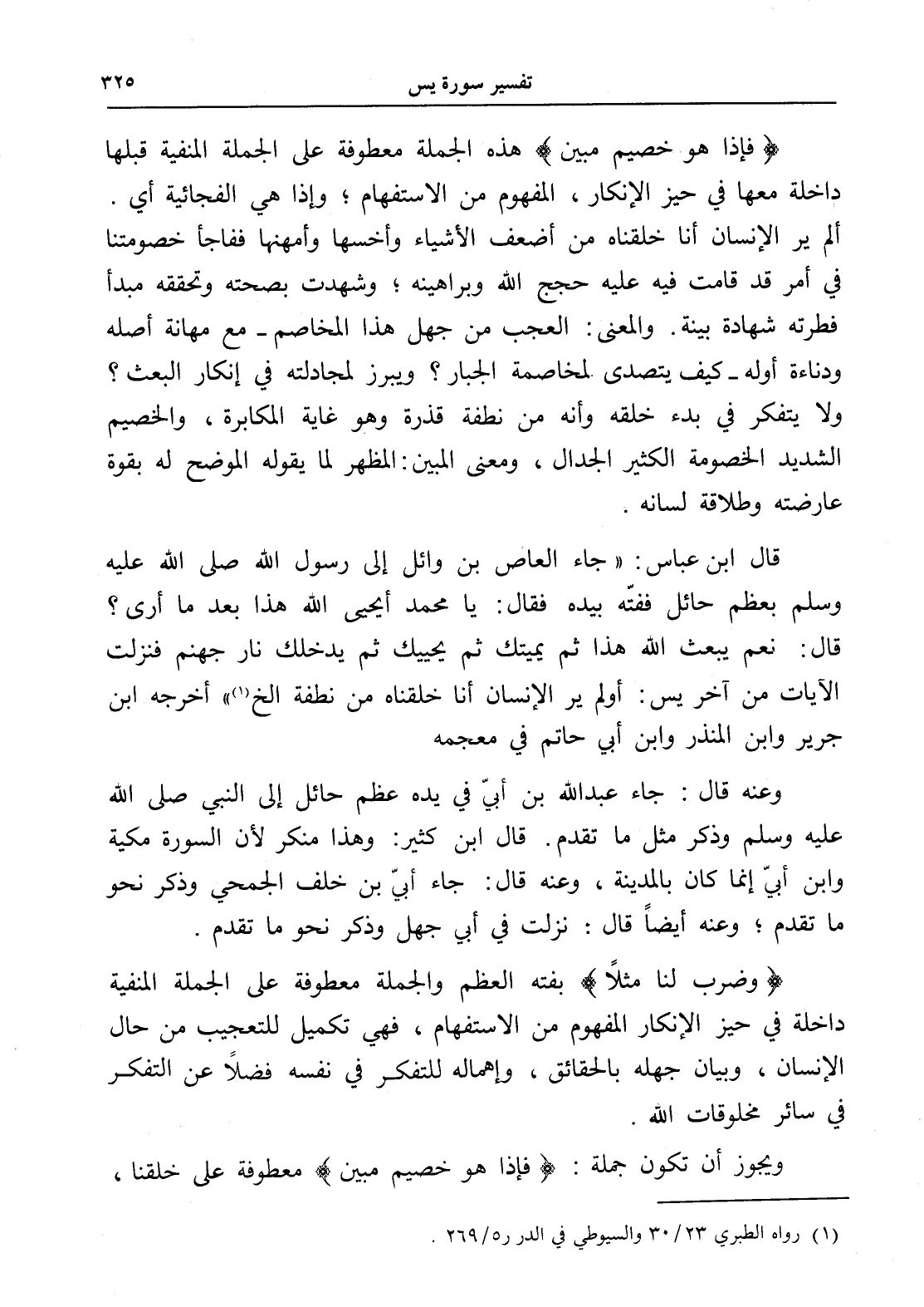 قال ابن عباس: " جاء العاص بن وائل إلى رسول الله صلى الله عليه وسلم بعظم حائل ففتّه بيده فقال: يا محمد أيحيى الله هذا بعد ما أرى؟ قال: نعم يبعث الله هذا ثم يميتك ثم يحييك ثم يدخلك نار جهنم فنزلت الآيات من آخر يس: أولم ير الإنسان أنا خلقناه من نطفة الخ (¬1) " أخرجه ابن جرير وابن المنذر وابن أبي حاتم في معجمه.
