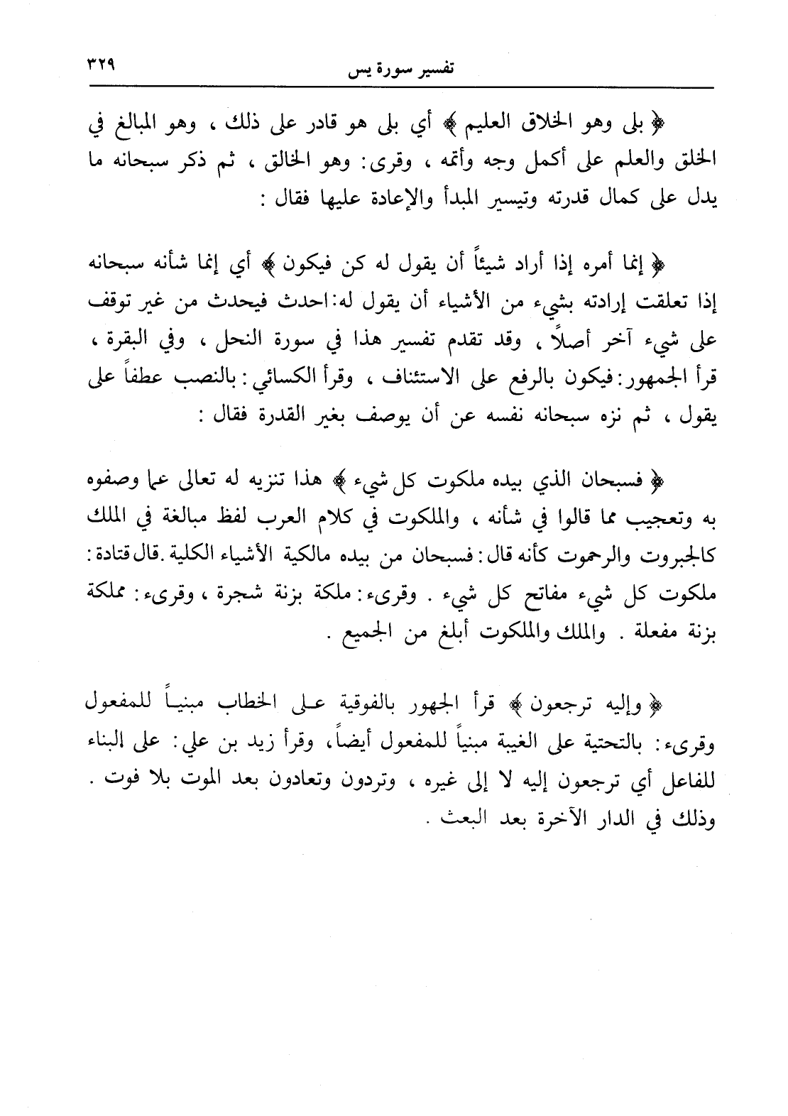 (بلى وهو الخلاق العليم) أي بلى هو قادر على ذلك، وهو المبالغ في الخلق والعلم على أكمل وجه وأتمه، وقرى: وهو الخالق، ثم ذكر سبحانه ما يدل على كمال قدرته وتيسير المبدأ والإعادة عليها فقال: