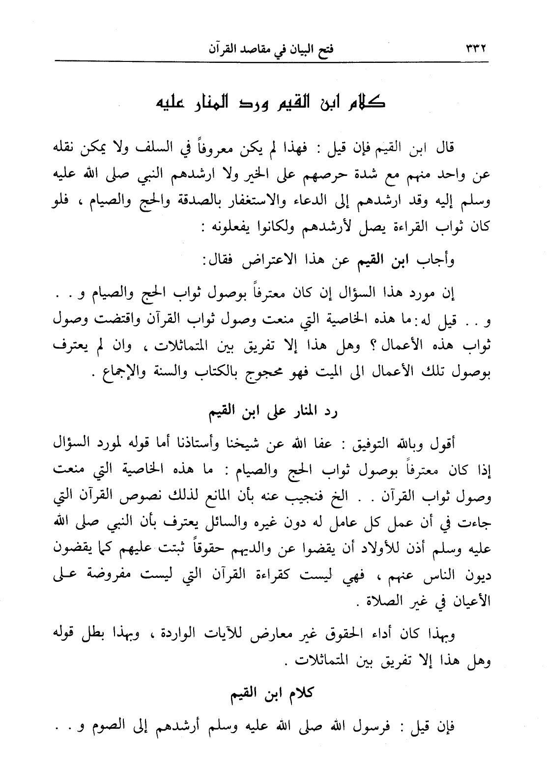 أقول وبالله التوفيق: عفا الله عن شيخنا وأستاذنا أما قوله لمورد السؤال إذا كان معترفاً بوصول ثواب الحج والصيام: ما هذه الخاصية التي منعت وصول ثواب القرآن .. الخ فنجيب عنه بأن المانع لذلك نصوص القرآن التي جاءت في أن عمل كل عامل له دون غيره والسائل يعترف بأن النبي صلى الله عليه وسلم أذن للأولاد أن يقضوا عن والديهم حقوقاً ثبتت عليهم كما يقضون ديون الناس عنهم، فهي ليست كقراءة القرآن التي ليست مفروضة على الأعيان في غير الصلاة.