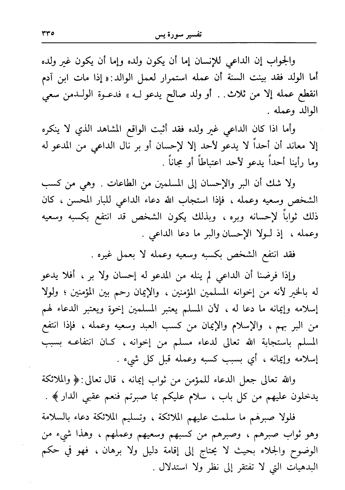 فلولا صبرهم ما سلمت عليهم الملائكة، وتسليم الملائكة دعاء بالسلامة وهو ثواب صبرهم، وصبرهم من كسبهم وسعيهم وعملهم، وهذا شيء من الوضوح والجلاء بحيث لا يحتاج إلى إقامة دليل ولا برهان، فهو في حكم البدهيات التي لا تفتقر إلى نظر ولا استدلال.