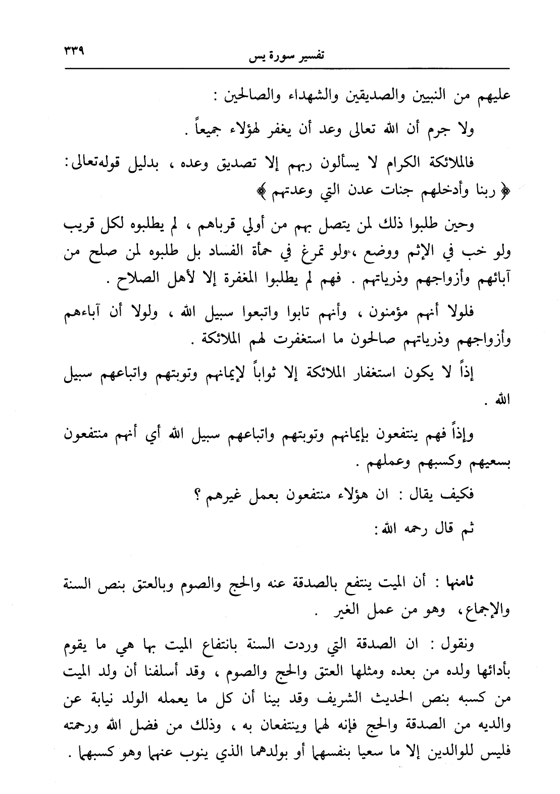 ثامنها: أن الميت ينتفع بالصدقة عنه والحج والصوم وبالعتق بنص السنة والإجماع، وهو من عمل الغير.