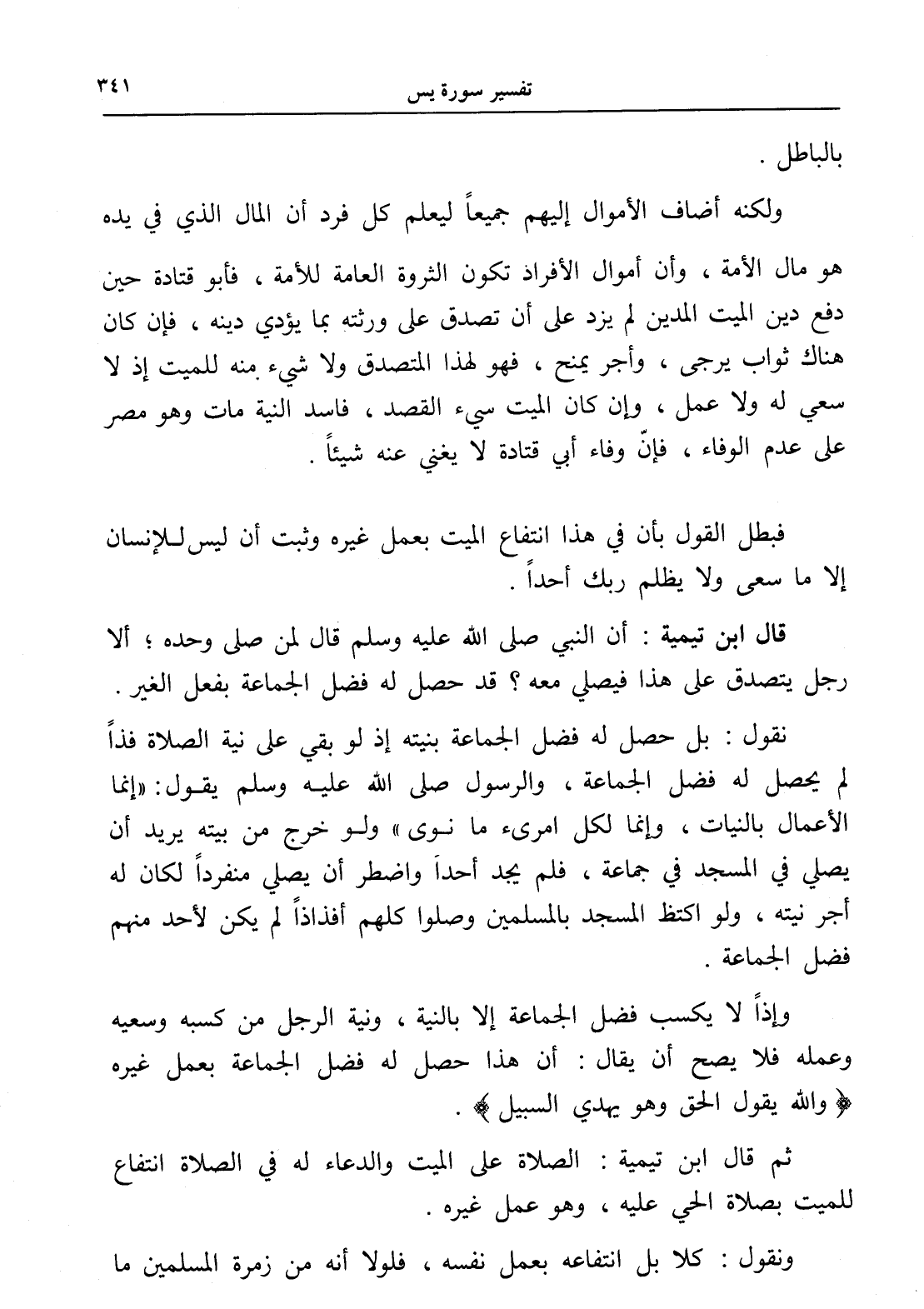 ولكنه أضاف الأموال إليهم جميعاً ليعلم كل فرد أن المال الذي في يده هو مال الأمة، وأن أموال الأفراد تكون الثروة العامة للأمة، فأبو قتادة حين دفع دين الميت المدين لم يزد على أن تصدق على ورثته بما يؤدي دينه، فإن كان هناك ثواب يرجى، وأجر يمنح، فهو لهذا المتصدق ولا شيء منه للميت إذ لا سعي له ولا عمل، وإن كان الميت سيء القصد، فاسد النية مات وهو مصر على عدم الوفاء، فإنّ وفاء أبي قتادة لا يغني عنه شيئاًً.