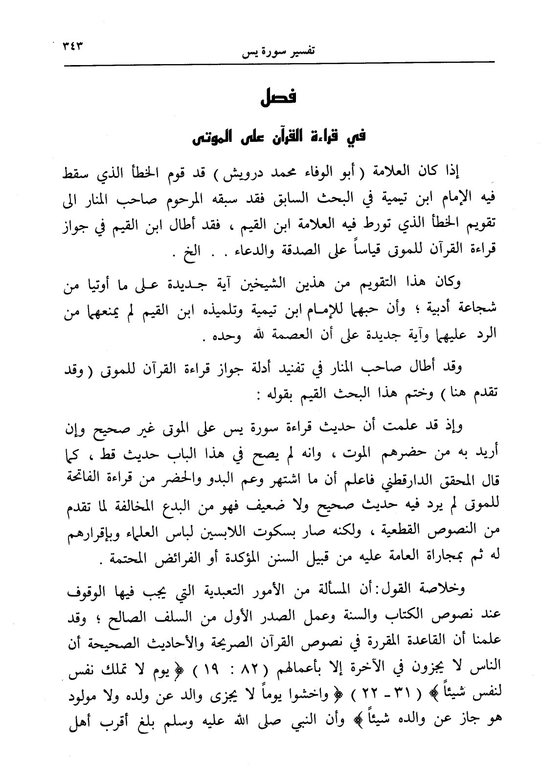 إذا كان العلامة (أبو الوفاء محمد درويش) قد قوم الخطأ الذي سقط فيه الإمام ابن تيمية في البحث السابق فقد سبقه المرحوم صاحب المنار إلى تقويم الخطأ الذي تورط فيه العلامة ابن القيم، فقد أطال ابن القيم في جواز قراءة القرآن للموتى قياساً على الصدقة والدعاء .. الخ.