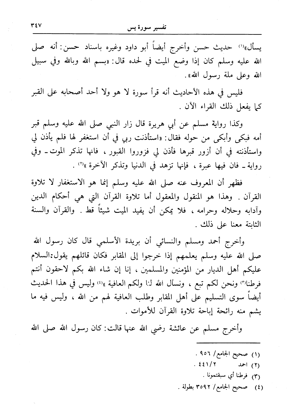 وأخرج أحمد ومسلم والنسائي أن بريدة الأسلمي قال كان رسول الله صلى الله عليه وسلم يعلمهم إذا خرجوا إلى المقابر فكان قائلهم يقول: السلام عليكم أهل الديار من المؤمنين والمسلمين، إنا إن شاء الله بكم لاحقون أنتم فرطنا (¬3) ونحن لكم تبع، ونسأل الله لنا ولكم العافية " (¬4) وليس في هذا الحديث أيضاًً سوى التسليم على أهل المقابر وطلب العافية لهم من الله، وليس فيه ما يشم منه رائحة إباحة تلاوة القرآن للأموات.
