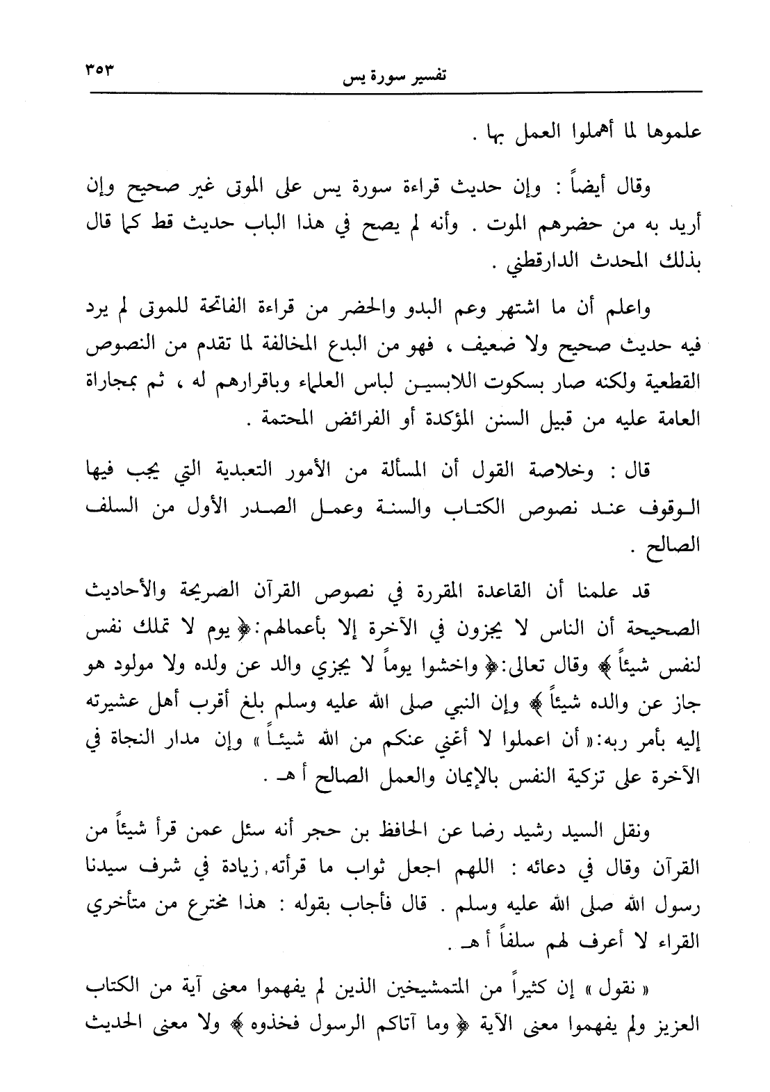 وقال أيضاًً: وإن حديث قراءة سورة يس على الموتى غير صحيح وإن أريد به من حضرهم الموت. وأنه لم يصح في هذا الباب حديث قط كما قال بذلك المحدث الدارقطني.