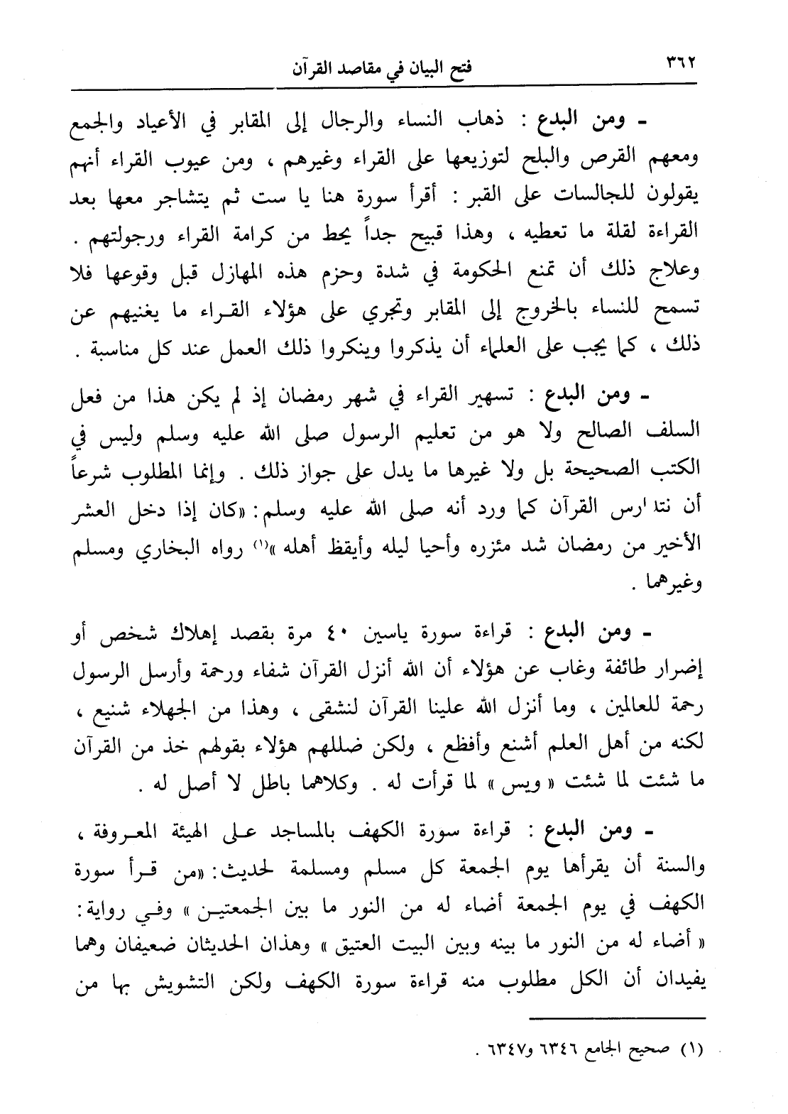 - ومن البدع: قراءة سورة الكهف بالمساجد على الهيئة المعروفة، والسنة أن يقرأها يوم الجمعة كل مسلم ومسلمة لحديث: " من قرأ سورة الكهف في يوم الجمعة أضاء له من النور ما بين الجمعتين " وفي رواية: " أضاء له من النور ما بينه وبين البيت العتيق " وهذان الحديثان ضعيفان وهما يفيدان أن الكل مطلوب منه قراءة سورة الكهف ولكن التشويش بها من