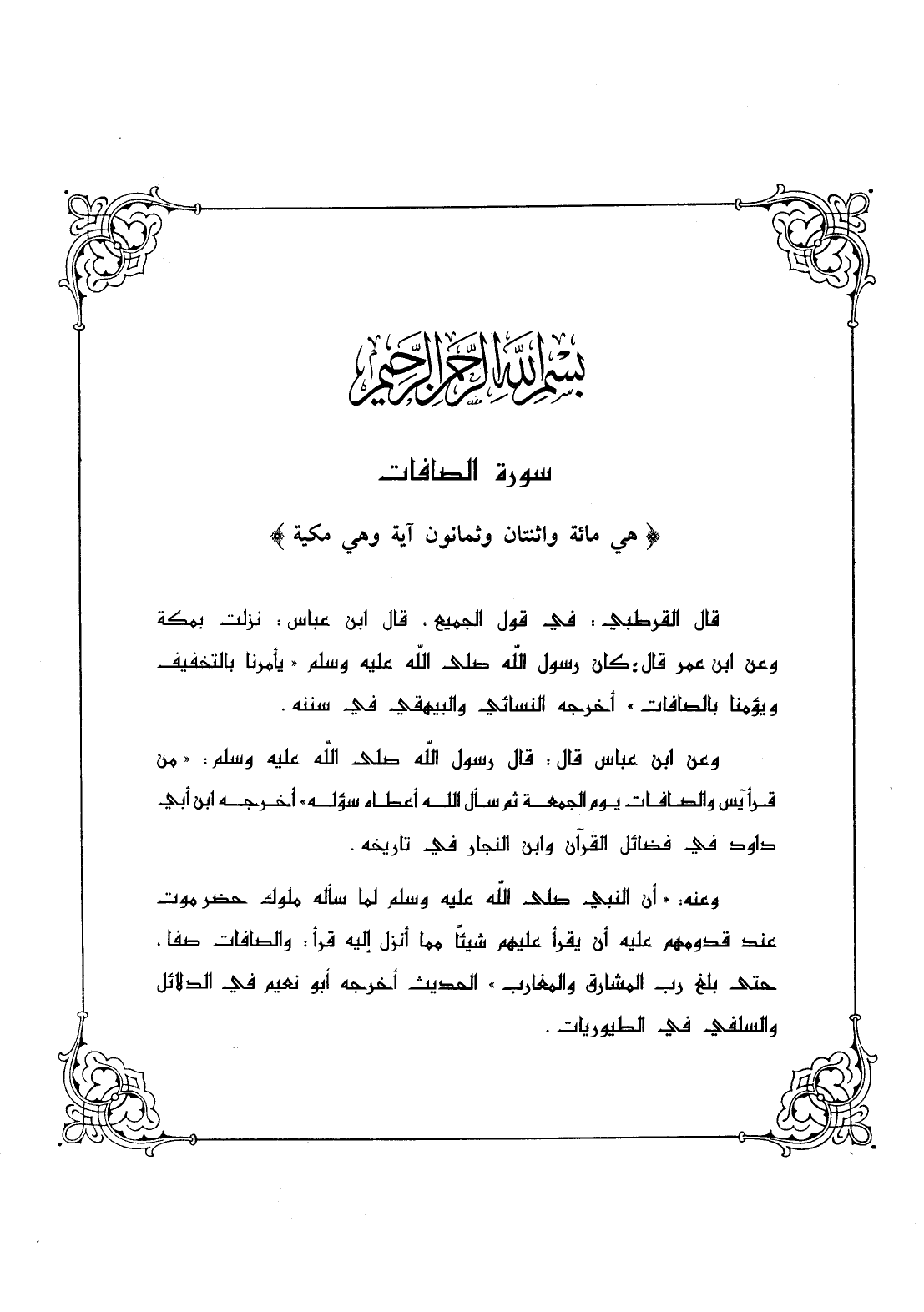 قال القرطبي: في قول الجميع، قال ابن عباس: نزلت بمكة وعن ابن عمر قال: كان رسول الله - صلى الله عليه وسلم - " يأمرنا بالتخفيف ويؤمنا بالصافات " أخرجه النسائي والبيهقي في سننه.