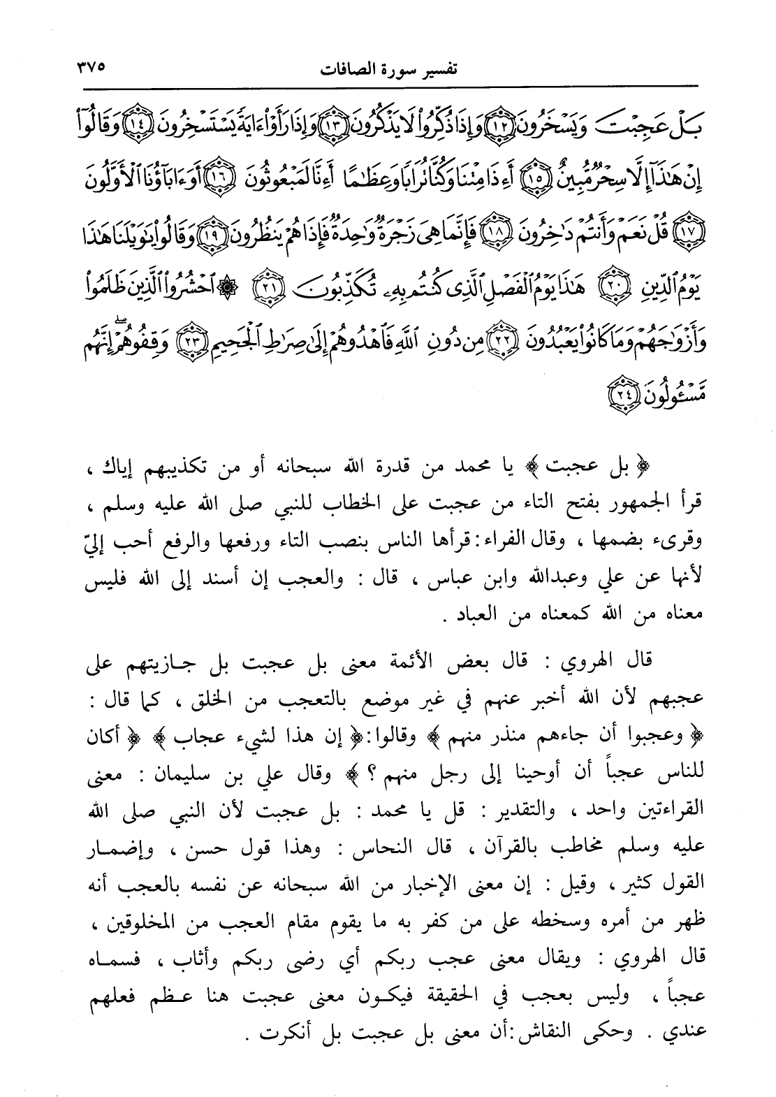 بَلْ عَجِبْتَ وَيَسْخَرُونَ (12) وَإِذَا ذُكِّرُوا لَا يَذْكُرُونَ (13) وَإِذَا رَأَوْا آيَةً يَسْتَسْخِرُونَ (14) وَقَالُوا إِنْ هَذَا إِلَّا سِحْرٌ مُبِينٌ (15) أَإِذَا مِتْنَا وَكُنَّا تُرَابًا وَعِظَامًا أَإِنَّا لَمَبْعُوثُونَ (16) أَوَآبَاؤُنَا الْأَوَّلُونَ (17) قُلْ نَعَمْ وَأَنْتُمْ دَاخِرُونَ (18) فَإِنَّمَا هِيَ زَجْرَةٌ وَاحِدَةٌ فَإِذَا هُمْ يَنْظُرُونَ (19) وَقَالُوا يَا وَيْلَنَا هَذَا يَوْمُ الدِّينِ (20) هَذَا يَوْمُ الْفَصْلِ الَّذِي كُنْتُمْ بِهِ تُكَذِّبُونَ (21) احْشُرُوا الَّذِينَ ظَلَمُوا وَأَزْوَاجَهُمْ وَمَا كَانُوا يَعْبُدُونَ (22) مِنْ دُونِ اللَّهِ فَاهْدُوهُمْ إِلَى صِرَاطِ الْجَحِيمِ (23) وَقِفُوهُمْ إِنَّهُمْ مَسْئُولُونَ (24)