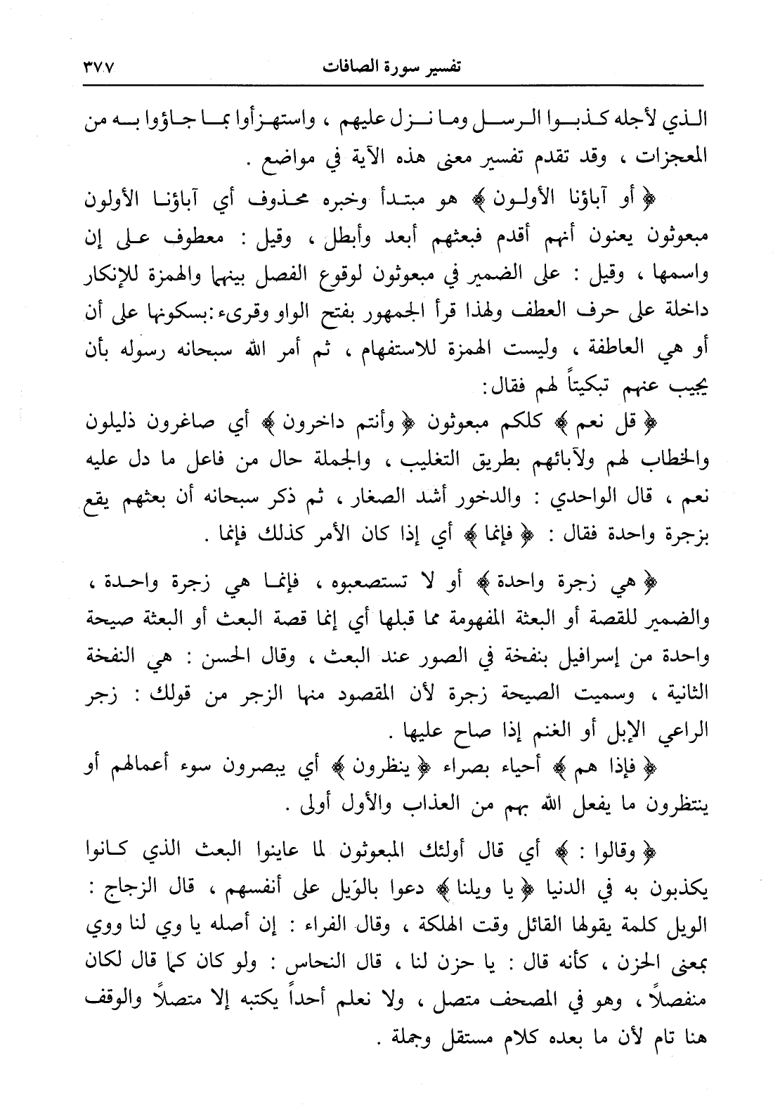 (هي زجرة واحدة) أو لا تستصعبوه، فإنما هي زجرة واحدة، والضمير للقصة أو البعثة المفهومة مما قبلها أي إنما قصة البعث أو البعثة صيحة واحدة من إسرافيل بنفخة في الصور عند البعث، وقال الحسن: هي النفخة الثانية، وسميت الصيحة زجرة لأن المقصود منها الزجر من قولك: زجر الراعي الإبل أو الغنم إذا صاح عليها.