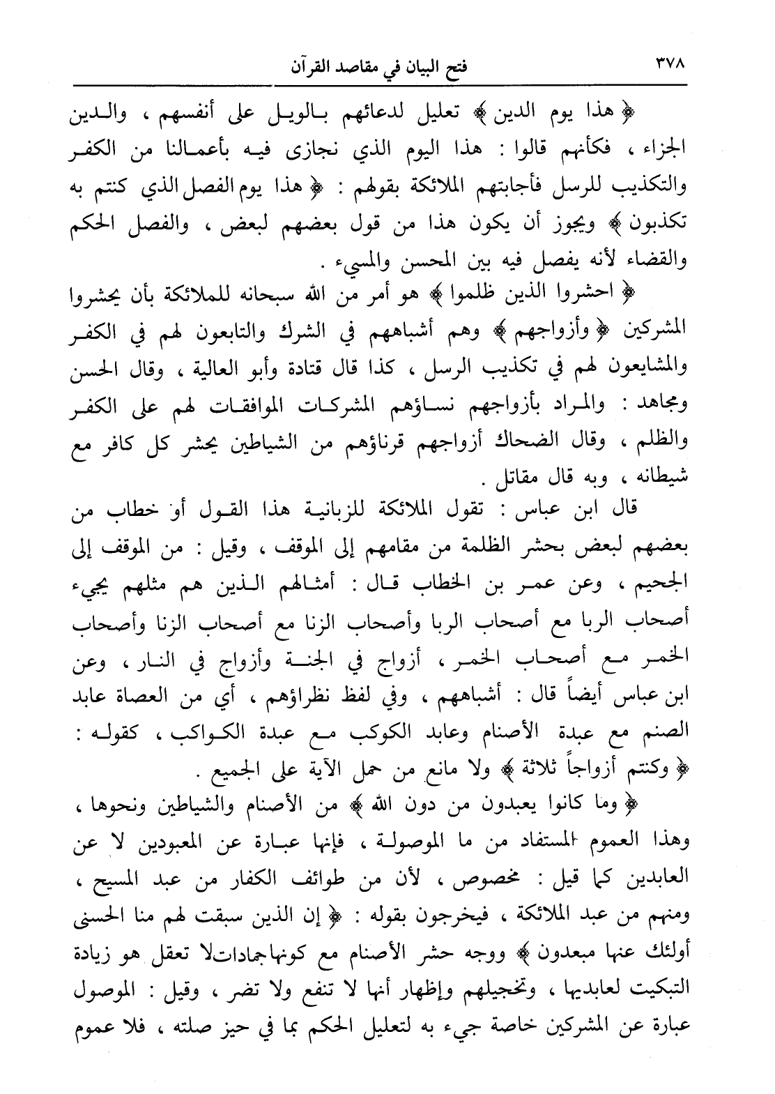 قال ابن عباس: تقول الملائكة للزبانية هذا القول أو خطاب من بعضهم لبعض بحشر الظلمة من مقامهم إلى الموقف، وقيل: من الموقف إلى الجحيم، وعن عمر بن الخطاب قال: أمثالهم الذين هم مثلهم يجيء أصحاب الربا مع أصحاب الربا وأصحاب الزنا مع أصحاب الزنا وأصحاب الخمر مع أصحاب الخمر، أزواج في الجنة وأزواج في النار، وعن ابن عباس أيضاًً قال: أشباههم، وفي لفظ نظراؤهم، أي من العصاة عابد الصنم مع عبدة الأصنام وعابد الكوكب مع عبدة الكواكب، كقوله: