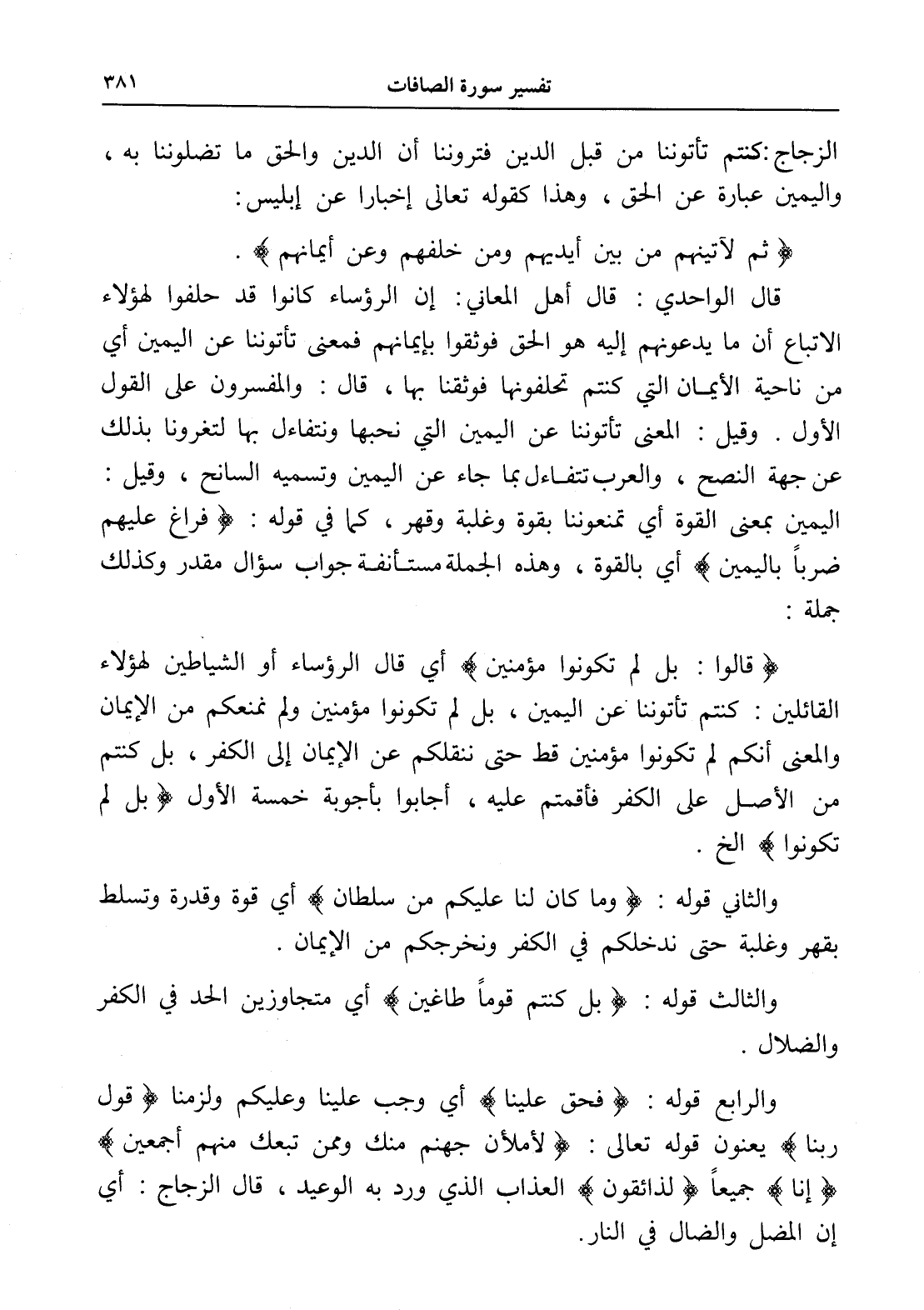 قال الواحدي: قال أهل المعاني: إن الرؤساء كانوا قد حلفوا لهؤلاء الاتباع أن ما يدعونهم إليه هو الحق فوثقوا بإيمانهم فمعنى تأتوننا عن اليمين أي من ناحية الأيمان التي كنتم تحلفونها فوثقنا بها، قال: والمفسرون على القول الأول. وقيل: المعنى تأتوننا عن اليمين التي نحبها ونتفاءل بها لتغرونا بذلك عن جهة النصح، والعرب تتفاءل بما جاء عن اليمين وتسميه السانح، وقيل: اليمين بمعنى القوة أي تمنعوننا بقوة وغلبة وقهر، كما في قوله: (فراغ عليهم ضرباً باليمين) أي بالقوة، وهذه الجملة مستأنفة جواب سؤال مقدر وكذلك جملة: