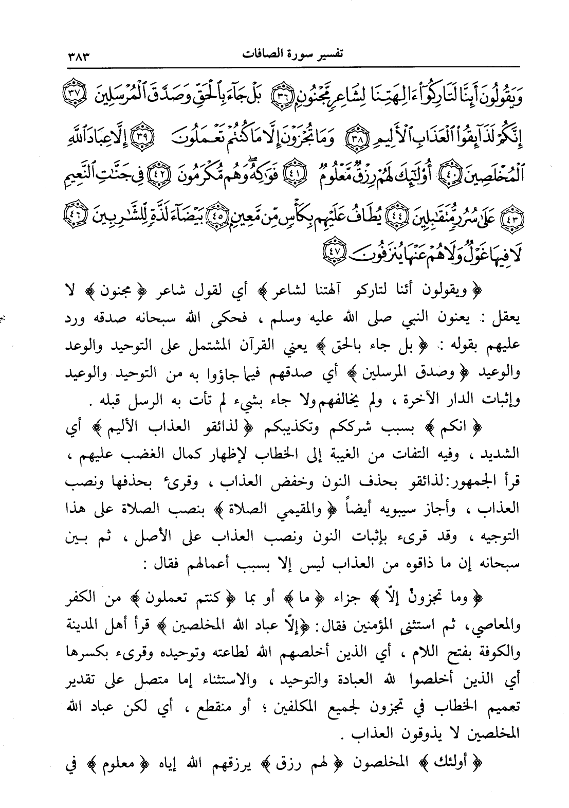 وَيَقُولُونَ أَئِنَّا لَتَارِكُو آلِهَتِنَا لِشَاعِرٍ مَجْنُونٍ (36) بَلْ جَاءَ بِالْحَقِّ وَصَدَّقَ الْمُرْسَلِينَ (37) إِنَّكُمْ لَذَائِقُو الْعَذَابِ الْأَلِيمِ (38) وَمَا تُجْزَوْنَ إِلَّا مَا كُنْتُمْ تَعْمَلُونَ (39) إِلَّا عِبَادَ اللَّهِ الْمُخْلَصِينَ (40) أُولَئِكَ لَهُمْ رِزْقٌ مَعْلُومٌ (41) فَوَاكِهُ وَهُمْ مُكْرَمُونَ (42) فِي جَنَّاتِ النَّعِيمِ (43) عَلَى سُرُرٍ مُتَقَابِلِينَ (44) يُطَافُ عَلَيْهِمْ بِكَأْسٍ مِنْ مَعِينٍ (45) بَيْضَاءَ لَذَّةٍ لِلشَّارِبِينَ (46) لَا فِيهَا غَوْلٌ وَلَا هُمْ عَنْهَا يُنْزَفُونَ (47)