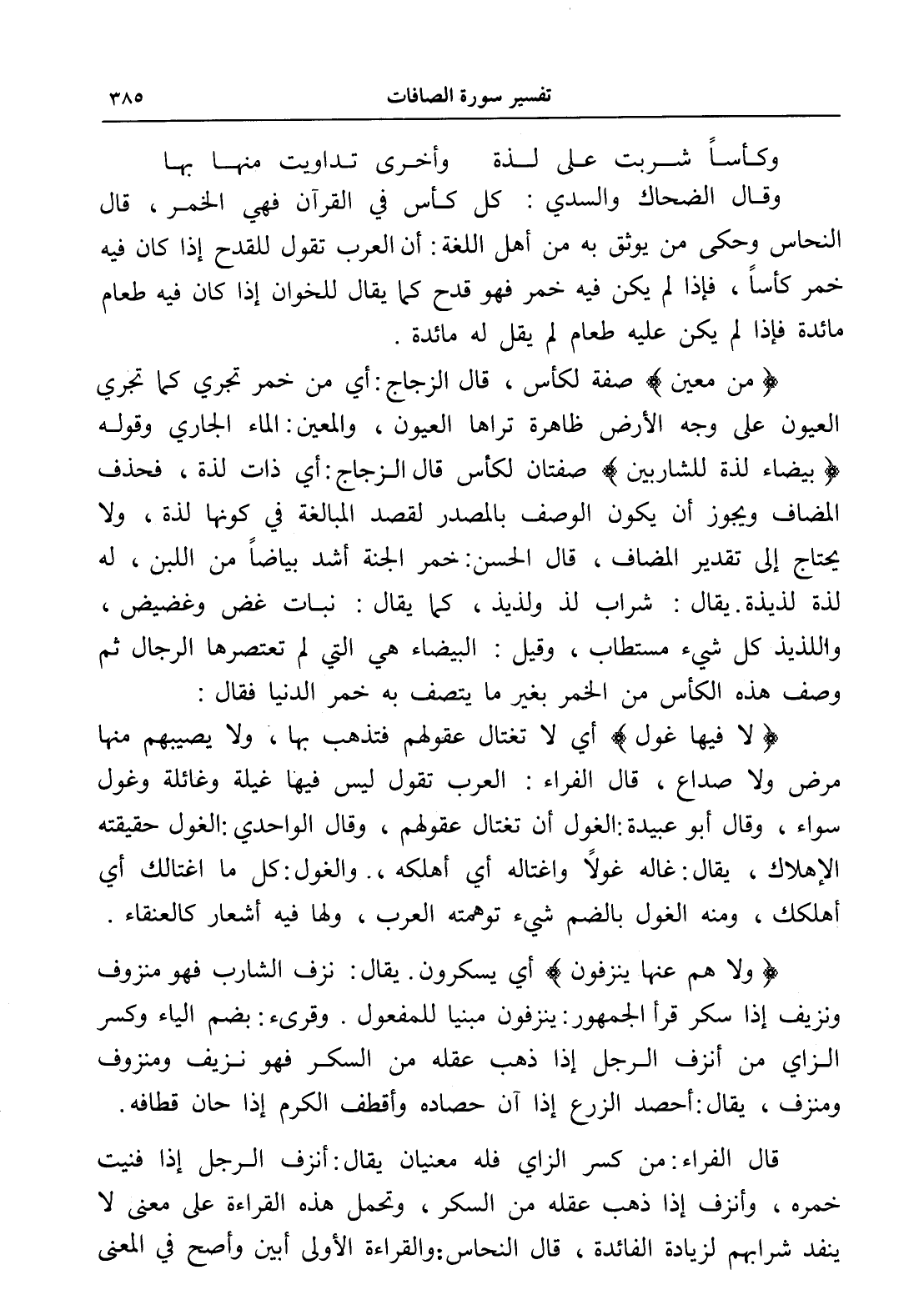 (بيضاء لذة للشاربين) صفتان لكأس قال الزجاج: أي ذات لذة، فحذف المضاف ويجوز أن يكون الوصف بالمصدر لقصد المبالغة في كونها لذة، ولا يحتاج إلى تقدير المضاف، قال الحسن: خمر الجنة أشد بياضاً من اللبن، له لذة لذيذة. يقال: شراب لذ ولذيذ، كما يقال: نبات غض وغضيض، واللذيذ كل شيء مستطاب، وقيل: البيضاء هي التي لم تعتصرها الرجال ثم وصف هذه الكأس من الخمر بغير ما يتصف به خمر الدنيا فقال: