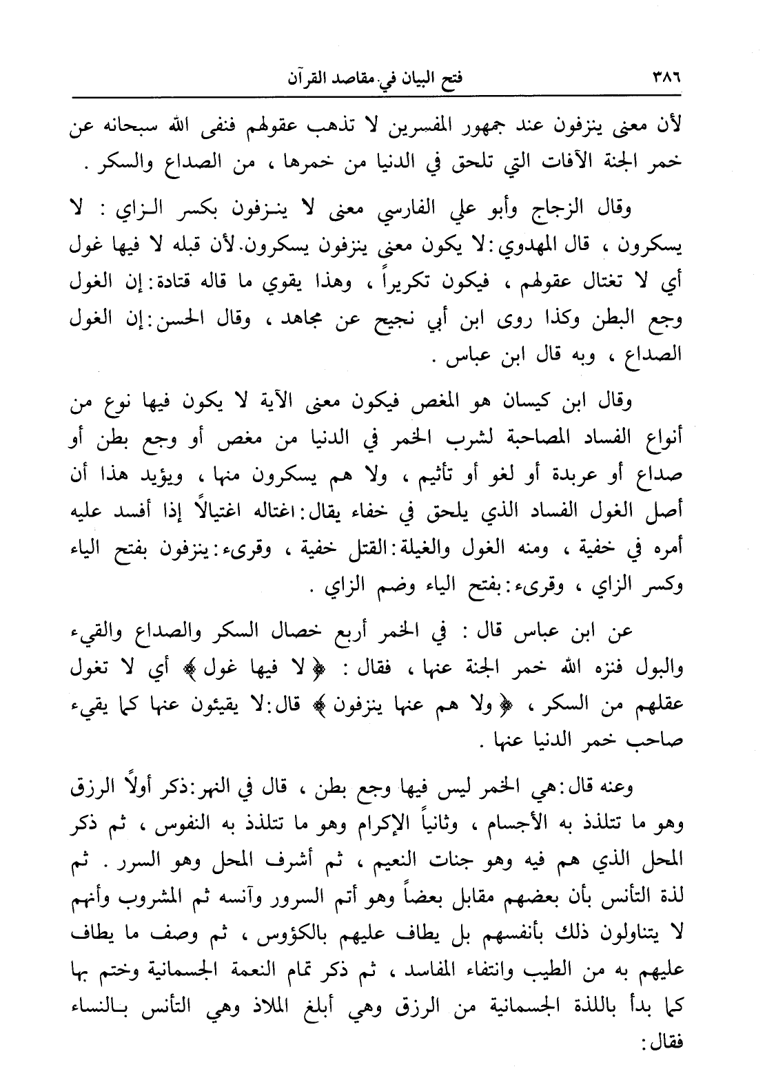 عن ابن عباس قال: في الخمر أربع خصال السكر والصداع والقيء والبول فنزه الله خمر الجنة عنها، فقال: (لا فيها غول) أي لا تغول عقلهم من السكر، (ولا هم عنها ينزفون) قال: لا يقيئون عنها كما يقيء صاحب خمر الدنيا عنها.