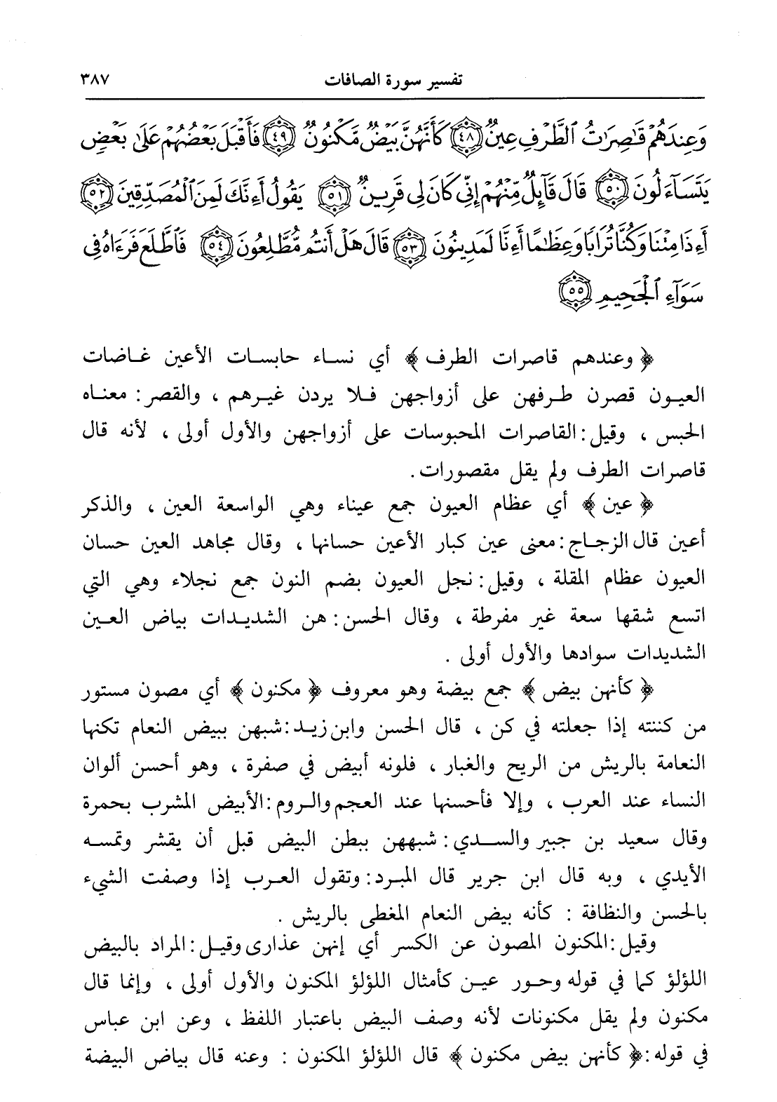 وَعِنْدَهُمْ قَاصِرَاتُ الطَّرْفِ عِينٌ (48) كَأَنَّهُنَّ بَيْضٌ مَكْنُونٌ (49) فَأَقْبَلَ بَعْضُهُمْ عَلَى بَعْضٍ يَتَسَاءَلُونَ (50) قَالَ قَائِلٌ مِنْهُمْ إِنِّي كَانَ لِي قَرِينٌ (51) يَقُولُ أَإِنَّكَ لَمِنَ الْمُصَدِّقِينَ (52) أَإِذَا مِتْنَا وَكُنَّا تُرَابًا وَعِظَامًا أَإِنَّا لَمَدِينُونَ (53) قَالَ هَلْ أَنْتُمْ مُطَّلِعُونَ (54) فَاطَّلَعَ فَرَآهُ فِي سَوَاءِ الْجَحِيمِ (55)