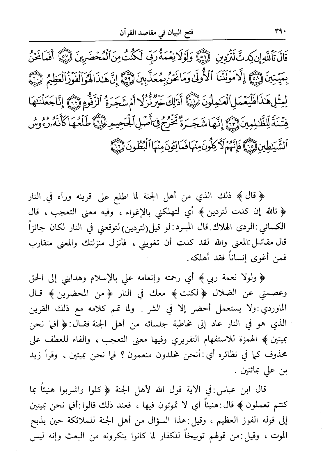 قَالَ تَاللَّهِ إِنْ كِدْتَ لَتُرْدِينِ (56) وَلَوْلَا نِعْمَةُ رَبِّي لَكُنْتُ مِنَ الْمُحْضَرِينَ (57) أَفَمَا نَحْنُ بِمَيِّتِينَ (58) إِلَّا مَوْتَتَنَا الْأُولَى وَمَا نَحْنُ بِمُعَذَّبِينَ (59) إِنَّ هَذَا لَهُوَ الْفَوْزُ الْعَظِيمُ (60) لِمِثْلِ هَذَا فَلْيَعْمَلِ الْعَامِلُونَ (61) أَذَلِكَ خَيْرٌ نُزُلًا أَمْ شَجَرَةُ الزَّقُّومِ (62) إِنَّا جَعَلْنَاهَا فِتْنَةً لِلظَّالِمِينَ (63) إِنَّهَا شَجَرَةٌ تَخْرُجُ فِي أَصْلِ الْجَحِيمِ (64) طَلْعُهَا كَأَنَّهُ رُءُوسُ الشَّيَاطِينِ (65) فَإِنَّهُمْ لَآكِلُونَ مِنْهَا فَمَالِئُونَ مِنْهَا الْبُطُونَ (66)