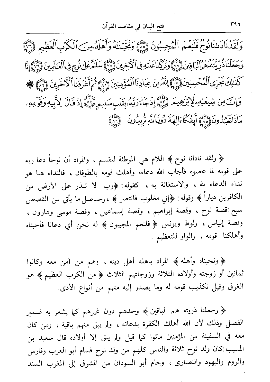 وَلَقَدْ نَادَانَا نُوحٌ فَلَنِعْمَ الْمُجِيبُونَ (75) وَنَجَّيْنَاهُ وَأَهْلَهُ مِنَ الْكَرْبِ الْعَظِيمِ (76) وَجَعَلْنَا ذُرِّيَّتَهُ هُمُ الْبَاقِينَ (77) وَتَرَكْنَا عَلَيْهِ فِي الْآخِرِينَ (78) سَلَامٌ عَلَى نُوحٍ فِي الْعَالَمِينَ (79) إِنَّا كَذَلِكَ نَجْزِي الْمُحْسِنِينَ (80) إِنَّهُ مِنْ عِبَادِنَا الْمُؤْمِنِينَ (81) ثُمَّ أَغْرَقْنَا الْآخَرِينَ (82) وَإِنَّ مِنْ شِيعَتِهِ لَإِبْرَاهِيمَ (83) إِذْ جَاءَ رَبَّهُ بِقَلْبٍ سَلِيمٍ (84) إِذْ قَالَ لِأَبِيهِ وَقَوْمِهِ مَاذَا تَعْبُدُونَ (85) أَئِفْكًا آلِهَةً دُونَ اللَّهِ تُرِيدُونَ (86)