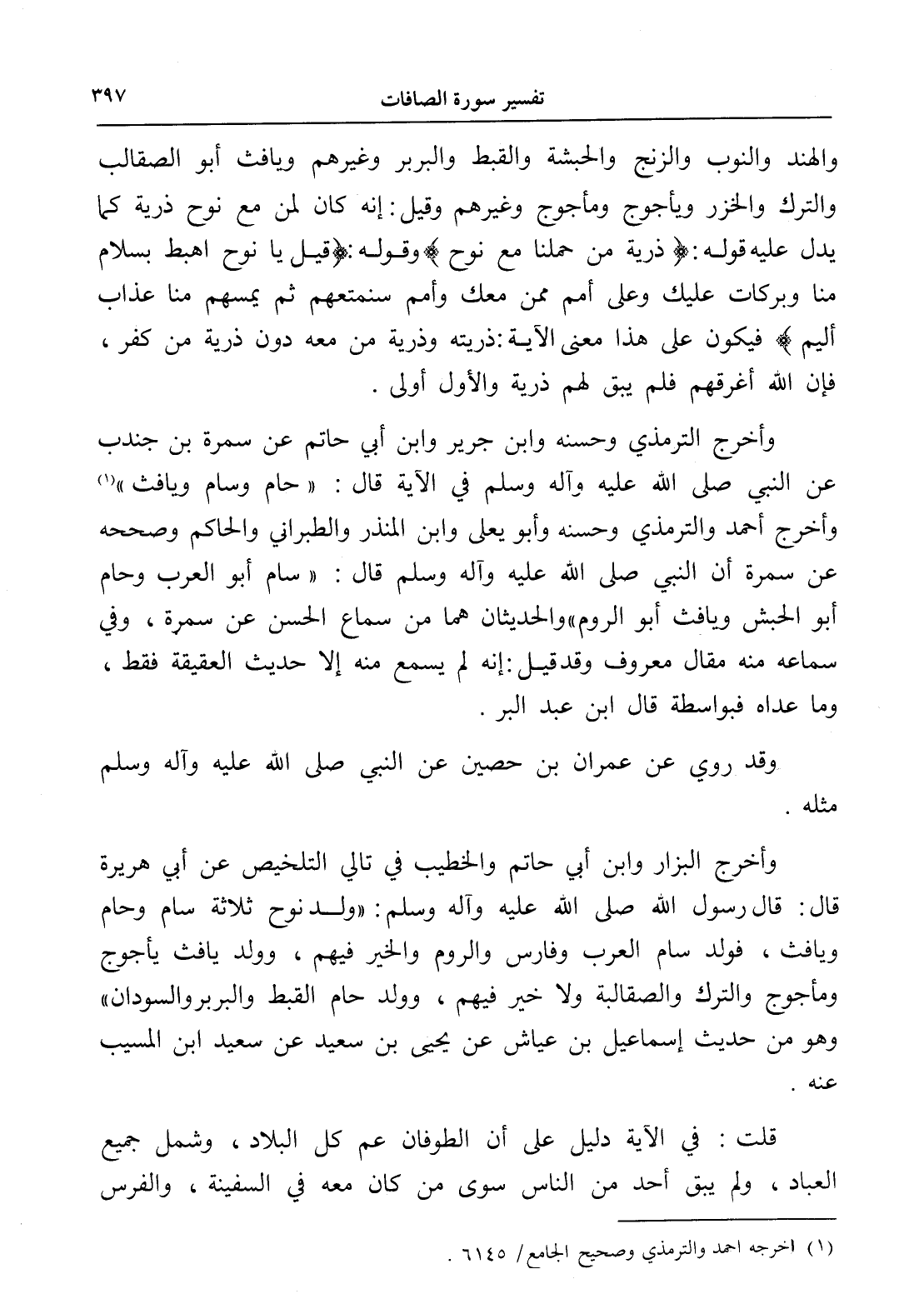 وأخرج الترمذي وحسنه وابن جرير وابن أبي حاتم عن سمرة بن جندب عن النبي صلى الله عليه وآله وسلم في الآية قال: " حام وسام ويافث " (¬1) وأخرج أحمد والترمذي وحسنه وأبو يعلى وابن المنذر والطبراني والحاكم وصححه عن سمرة أن النبي صلى الله عليه وآله وسلم قال: " سام أبو العرب وحام أبو الحبش ويافث أبو الروم " والحديثان هما من سماع الحسن عن سمرة، وفي سماعه منه مقال معروف وقد قيل: إنه لم يسمع منه إلا حديث العقيقة فقط، وما عداه فبواسطة قال ابن عبد البر.
