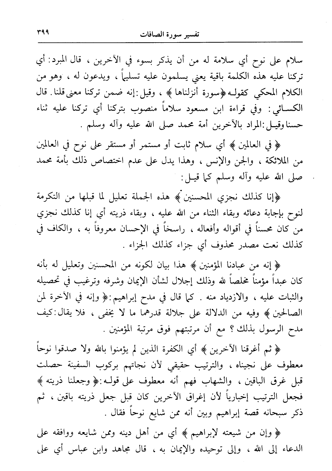 سلام على نوح أي سلامة له من أن يذكر بسوء في الآخرين، قال المبرد: أي تركنا عليه هذه الكلمة باقية يعني يسلمون عليه تسليماً، ويدعون له، وهو من الكلام المحكي كقوله (سورة أنزلناها)، وقيل: إنه ضمن تركنا معنى قلنا. قال الكسائي: وفي قراءة ابن مسعود سلاماً منصوب بتركنا أي تركنا عليه ثناء حسنا وقيل: المراد بالآخرين أمة محمد صلى الله عليه وآله وسلم.