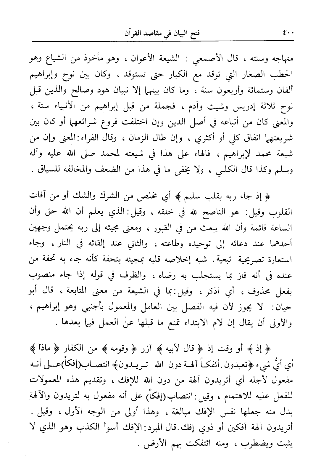 (إذ جاء ربه بقلب سليم) أي مخلص من الشرك والشك أو من آفات القلوب وقيل: هو الناصح لله في خلقه، وقيل: الذي يعلم أن الله حق وأن الساعة قائمة وأن الله يبعث من في القبور، ومعنى مجيئه إلى ربه يحتمل وجهين أحدهما عند دعائه إلى توحيده وطاعته، والثاني عند إلقائه في النار، وجاء استعارة تصريحية تبعية. شبه إخلاصه قلبه بمجيئه بتحفة كأنه جاء به تحفة من عنده في أنه فاز بما يستجلب به رضاه، والظرف في قوله إذا جاء منصوب بفعل محذوف، أي أذكر، وقيل: بما في الشيعة من معنى المتابعة، قال أبو حيان: لا يجوز لأن فيه الفصل بين العامل والمعمول بأجنبي وهو إبراهيم، والأولى أن يقال إن لام الابتداء تمنع ما قبلها عن العمل فيما بعدها.