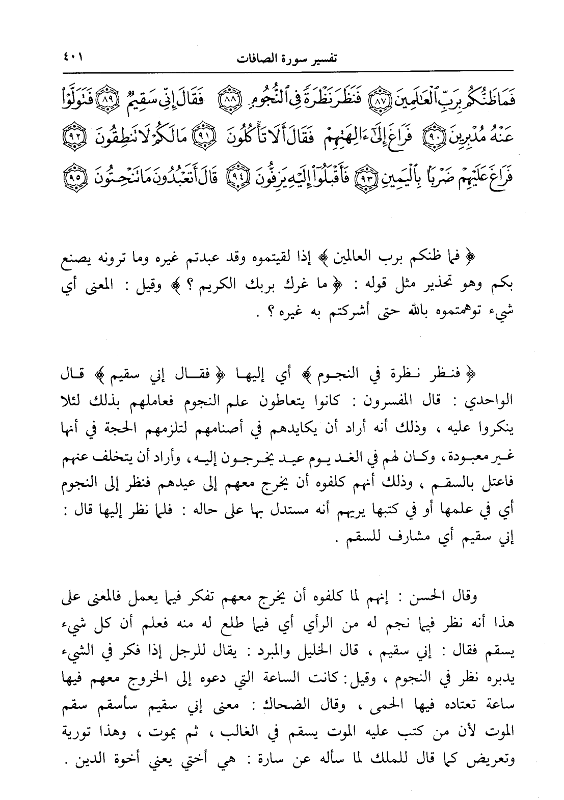 وقال الحسن: إنهم لما كلفوه أن يخرج معهم تفكر فيما يعمل فالمعنى على هذا أنه نظر فيما نجم له من الرأي أي فيما طلع له منه فعلم أن كل شيء يسقم فقال: إني سقيم، قال الخليل والمبرد: يقال للرجل إذا فكر في الشيء يدبره نظر في النجوم، وقيل: كانت الساعة التي دعوه إلى الخروج معهم فيها ساعة تعتاده فيها الحمى، وقال الضحاك: معنى إني سقيم سأسقم سقم الموت لأن من كتب عليه الموت يسقم في الغالب، ثم يموت، وهذا تورية وتعريض كما قال للملك لما سأله عن سارة: هي أختي يعني أخوة الدين.