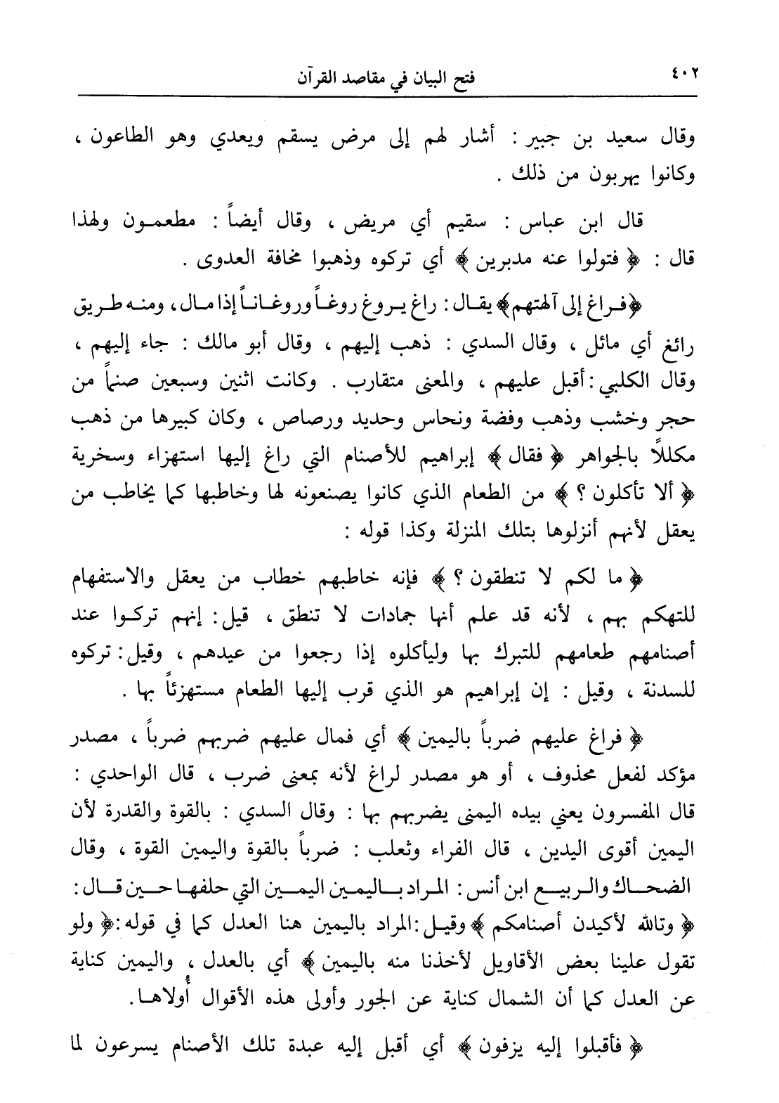 (فراغ عليهم ضرباً باليمين) أي فمال عليهم ضربهم ضرباً، مصدر مؤكد لفعل محذوف، أو هو مصدر لراغ لأنه بمعنى ضرب، قال الواحدي: قال المفسرون يعني بيده اليمنى يضربهم بها: وقال السدي: بالقوة والقدرة لأن اليمين أقوى اليدين، قال الفراء وثعلب: ضرباً بالقوة واليمين القوة، وقال الضحاك والربيع ابن أنس: المراد باليمين اليمين التي حلفها حين قال: (وتالله لأكيدن أصنامكم) وقيل: المراد باليمين هنا العدل كما في قوله: (ولو تقول علينا بعض الأقاويل لأخذنا منه باليمين) أي بالعدل، واليمين كناية عن العدل كما أن الشمال كناية عن الجور وأولى هذه الأقوال أُولاها.