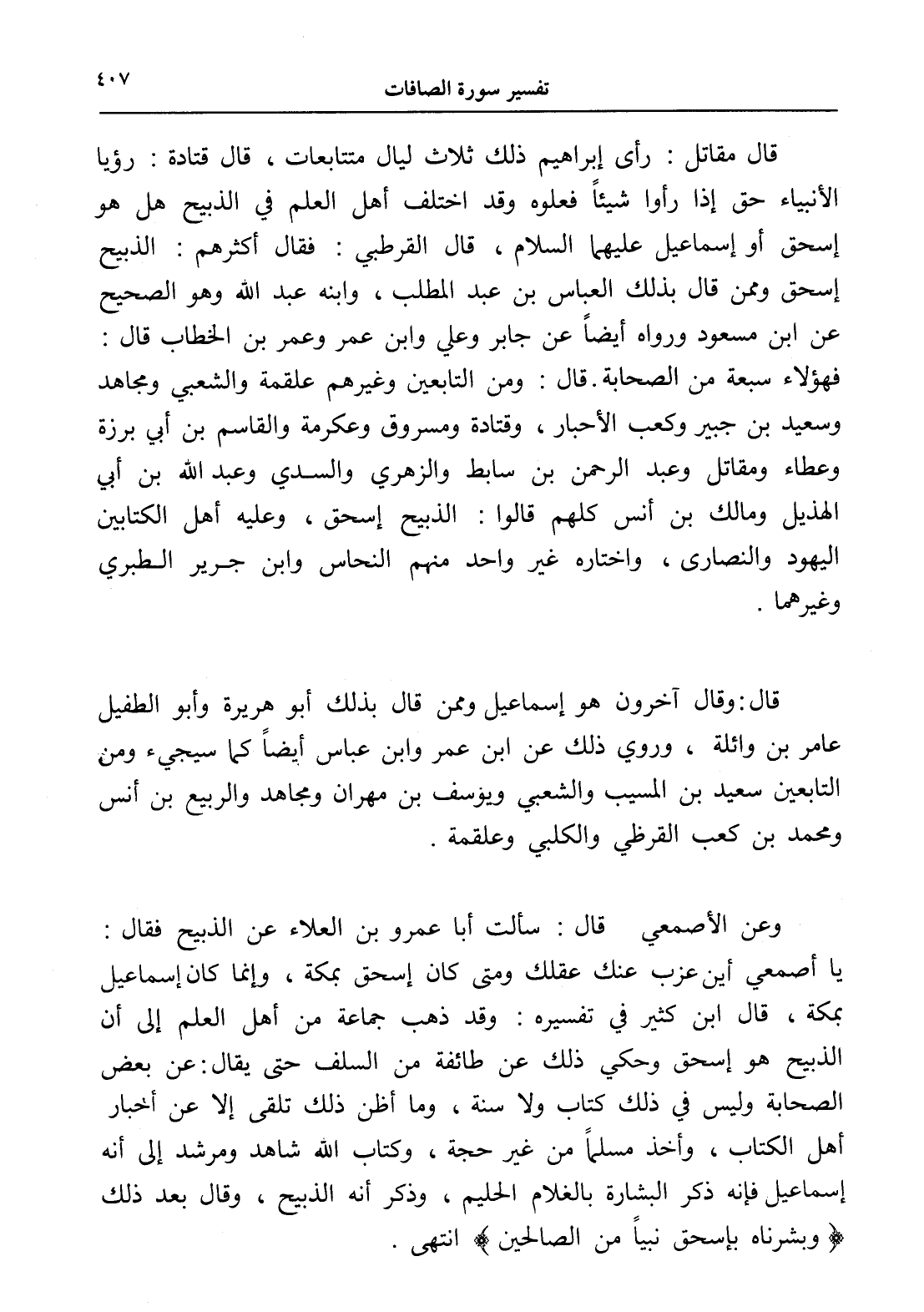 وعن الأصمعي قال: سألت أبا عمرو بن العلاء عن الذبيح فقال: يا أصمعي أين عزب عنك عقلك ومتى كان إسحق بمكة، وإنما كان إسماعيل بمكة، قال ابن كثير في تفسيره: وقد ذهب جماعة من أهل العلم إلى أن الذبيح هو إسحق وحكي ذلك عن طائفة من السلف حتى يقال: عن بعض الصحابة وليس في ذلك كتاب ولا سنة، وما أظن ذلك تلقى إلا عن أخبار أهل الكتاب، وأخذ مسلماً من غير حجة، وكتاب الله شاهد ومرشد إلى أنه إسماعيل فإنه ذكر البشارة بالغلام الحليم، وذكر أنه الذبيح، وقال بعد ذلك (وَبَشَّرْنَاهُ بِإِسْحَاقَ نَبِيًّا مِنَ الصَّالِحِينَ) انتهى.