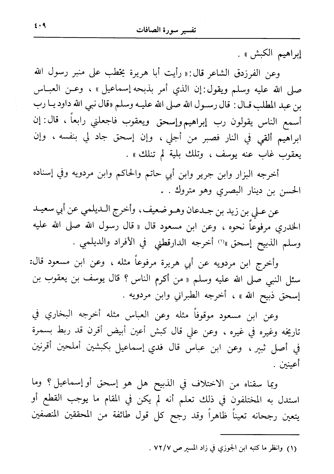 وعن الفرزدق الشاعر قال: " رأيت أبا هريرة يخطب على منبر رسول الله صلى الله عليه وسلم ويقول: إن الذي أمر بذبحه إسماعيل "، وعن العباس بن عبد المطلب قال: قال رسول الله صلى الله عليه وسلم " قال نبي الله داود يا رب أسمع الناس يقولون رب إبراهيم وإسحق ويعقوب فاجعلني رابعاً، قال: إن إبراهيم ألقي في النار فصبر من أجلي، وإن إسحق جاد لي بنفسه، وإن يعقوب غاب عنه يوسف، وتلك بلية لم تنلك ".