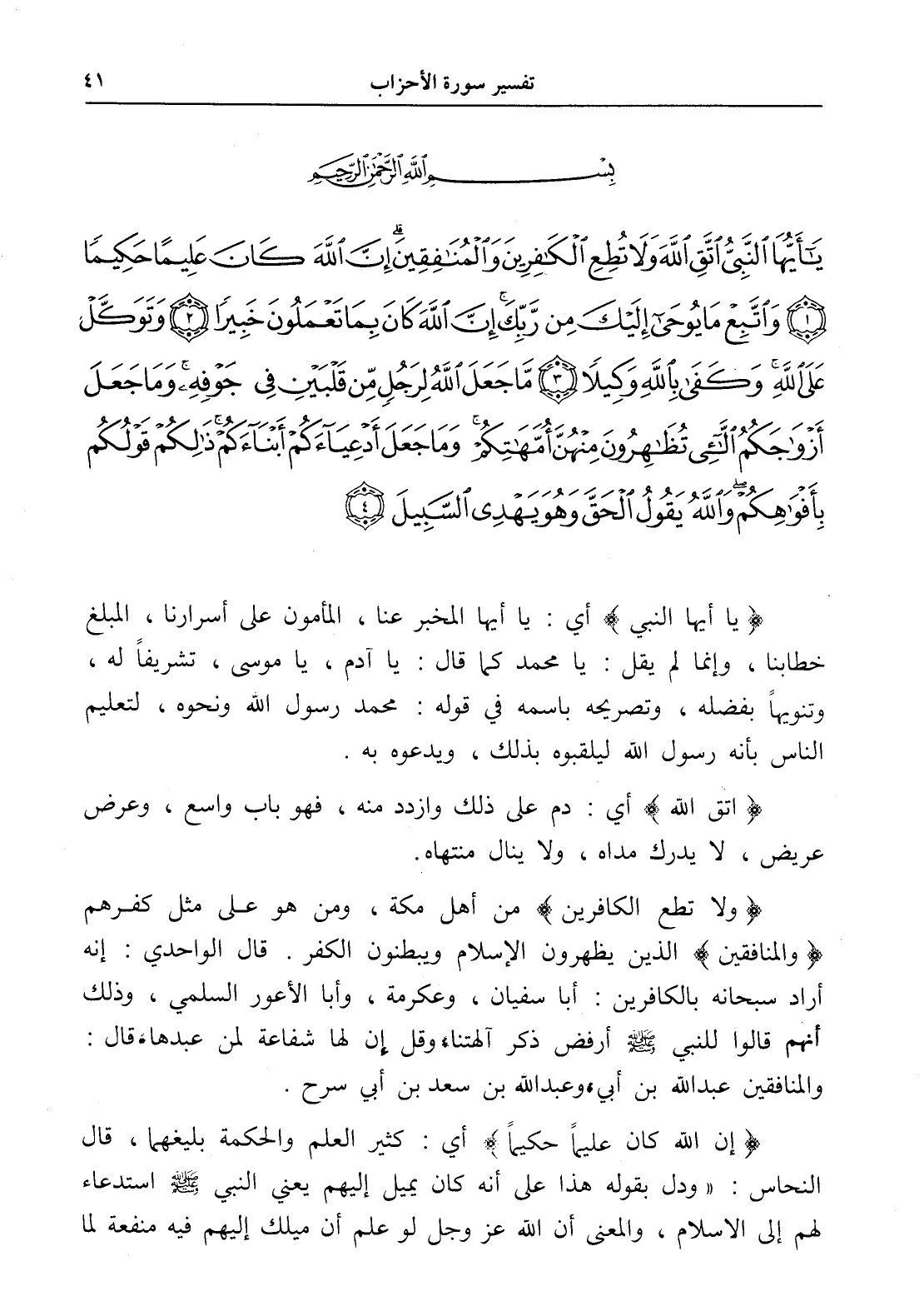 يَا أَيُّهَا النَّبِيُّ اتَّقِ اللَّهَ وَلَا تُطِعِ الْكَافِرِينَ وَالْمُنَافِقِينَ إِنَّ اللَّهَ كَانَ عَلِيماً حَكِيماً (1) وَاتَّبِعْ مَا يُوحَى إِلَيْكَ مِنْ رَبِّكَ إِنَّ اللَّهَ كَانَ بِمَا تَعْمَلُونَ خَبِيراً (2) وَتَوَكَّلْ عَلَى اللَّهِ وَكَفَى بِاللَّهِ وَكِيلاً (3) مَا جَعَلَ اللَّهُ لِرَجُلٍ مِنْ قَلْبَيْنِ فِي جَوْفِهِ وَمَا جَعَلَ أَزْوَاجَكُمُ اللَّائِي تُظَاهِرُونَ مِنْهُنَّ أُمَّهَاتِكُمْ وَمَا جَعَلَ أَدْعِيَاءَكُمْ أَبْنَاءَكُمْ ذَلِكُمْ قَوْلُكُمْ بِأَفْوَاهِكُمْ وَاللَّهُ يَقُولُ الْحَقَّ وَهُوَ يَهْدِي السَّبِيلَ (4)