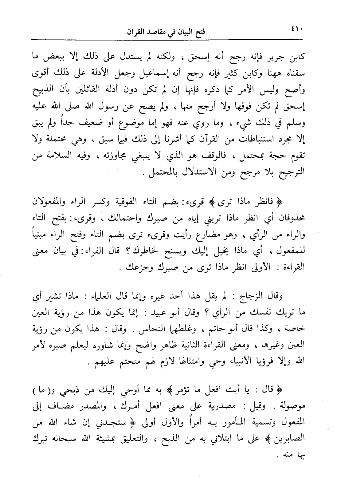 كابن جرير فإنه رجح أنه إسحق، ولكنه لم يستدل على ذلك إلا ببعض ما سقناه ههنا وكابن كثير فإنه رجح أنه إسماعيل وجعل الأدلة على ذلك أقوى وأصح وليس الأمر كما ذكره فإنها إن لم تكن دون أدلة القائلين بأن الذبيح إسحق لم تكن فوقها ولا أرجح منها، ولم يصح عن رسول الله صلى الله عليه وسلم في ذلك شيء، وما روي عنه فهو إما موضوع أو ضعيف جداً ولم يبق إلا مجرد استنباطات من القرآن كما أشرنا إلى ذلك فيما سبق، وهي محتملة ولا تقوم حجة بمحتمل، فالوقف هو الذي لا ينبغي مجاوزته، وفيه السلامة من الترجيح بلا مرجح ومن الاستدلال بالمحتمل.