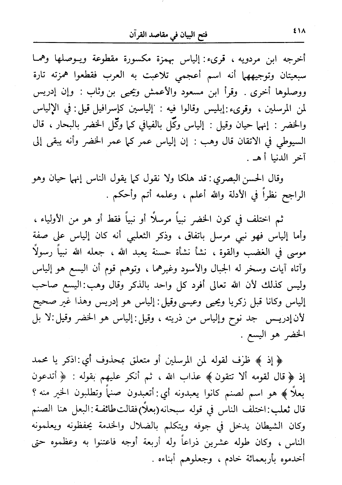 ثم اختلف في كون الخضر نبياً مرسلاً أو نبياً فقط أو هو من الأولياء، وأما إلياس فهو نبي مرسل باتفاق، وذكر الثعلبي أنه كان إلياس على صفة موسى في الغضب والقوة، نشأ نشأة حسنة يعبد الله، جعله الله نبياً رسولاً وآتاه آيات وسخر له الجبال والأسود وغيرهما، وتوهم قوم أن اليسع هو إلياس وليس كذلك لأن الله تعالى أفرد كل واحد بالذكر وقال وهب: اليسع صاحب إلياس وكانا قبل زكريا ويحيى وعيسى وقيل: إلياس هو إدريس وهذا غير صحيح لأن إدريس جد نوح وإلياس من ذريته، وقيل: إلياس هو الخضر وقيل: لا بل الخضر هو اليسع.