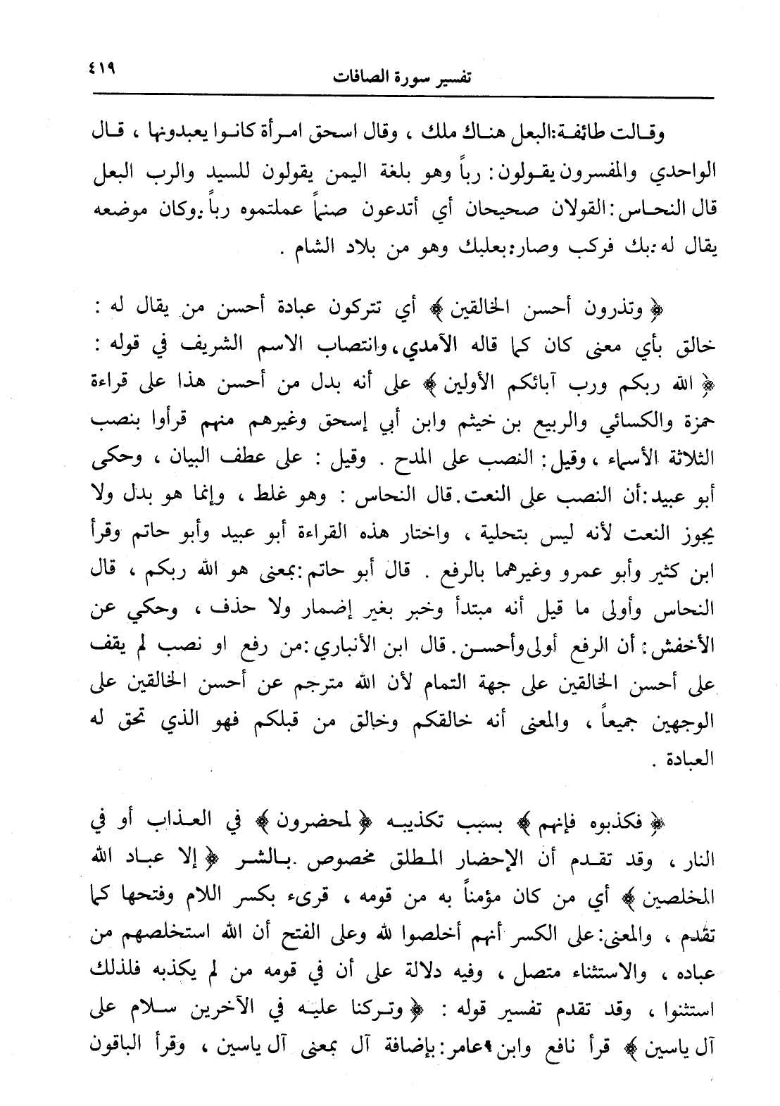 وقالت طائفة: البعل هناك ملك، وقال إسحق امرأة كانوا يعبدونها، قال الواحدي والمفسرون يقولون: رباً وهو بلغة اليمن يقولون للسيد والرب البعل قال النحاس: القولان صحيحان أي أتدعون صنماً عملتموه رباً، وكان موضعه يقال له: بك فركب وصار: بعلبك وهو من بلاد الشام.