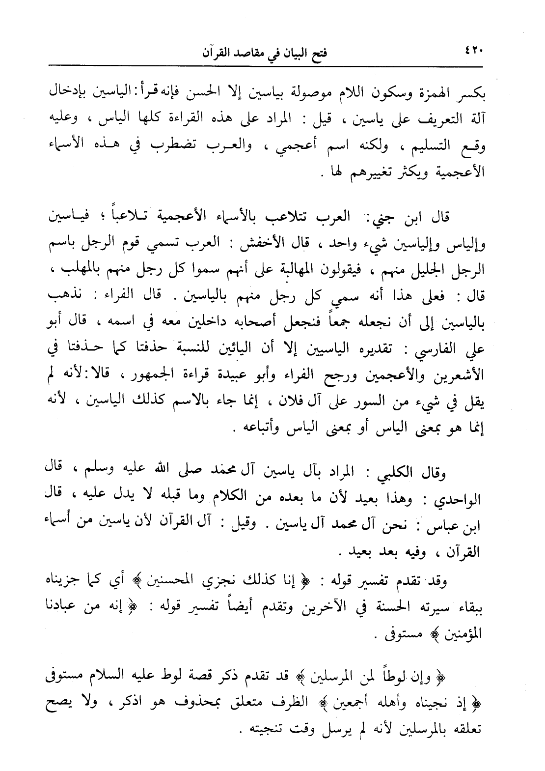 قال ابن جني: العرب تتلاعب بالأسماء الأعجمية تلاعباً؛ فياسين وإلياس وإلياسين شيء واحد، قال الأخفش: العرب تسمي قوم الرجل باسم الرجل الجليل منهم، فيقولون المهالبة على أنهم سموا كل رجل منهم بالمهلب، قال: فعلى هذا أنه سمي كل رجل منهم بالياسين. قال الفراء: نذهب بالياسين إلى أن نجعله جمعاً فنجعل أصحابه داخلين معه في اسمه، قال أبو علي الفارسي: تقديره الياسيين إلا أن اليائين للنسبة حذفتا كما حذفتا في الأشعرين والأعجمين ورجح الفراء وأبو عبيدة قراءة الجمهور، قالا: لأنه لم يقل في شيء من السور على آل فلان، إنما جاء بالاسم كذلك الياسين، لأنه إنما هو بمعنى إلياس أو بمعنى إلياس وأتباعه.