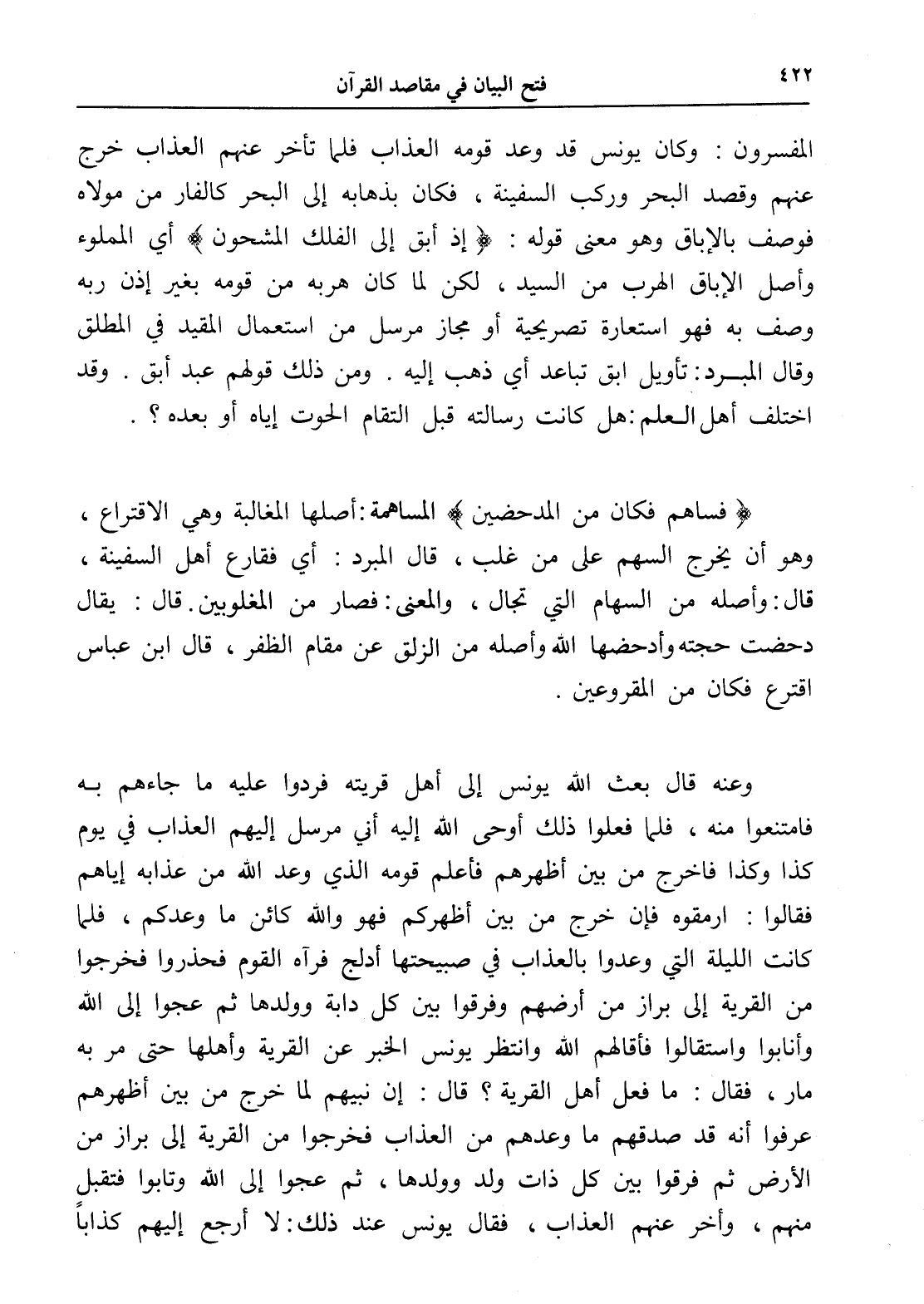 (إذ أبق إلى الفلك المشحون) أي المملوء وأصل الإباق الهرب من السيد، لكن لما كان هربه من قومه بغير إذن ربه وصف به فهو استعارة تصريحيية أو مجاز مرسل من استعمال المقيد في المطلق وقال المبرد: تأويل ابق تباعد أي ذهب إليه. ومن ذلك قولهم عبد أبق. وقد اختلف أهل العلم: هل كانت رسالته قبل التقام الحوت إياه أو بعده؟.