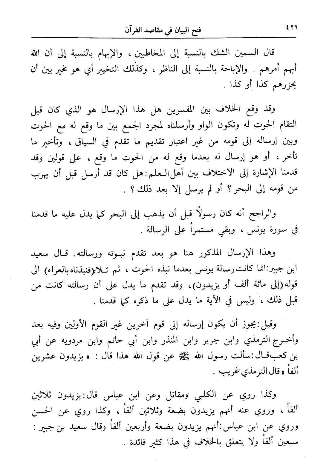 وهذا الإرسال المذكور هنا هو بعد تقدم نبوته ورسالته. قال سعيد ابن جبير: إنما كانت رسالة يونس بعد ما نبذه الحوت، ثم تلا: (فنبذناه بالعراء) إلى قوله (إلى مائة ألف أو يزيدون)، وقد تقدم ما يدل على أن رسالته كانت من قبل ذلك، وليس في الآية ما يدل على ما ذكره كما قدمنا.