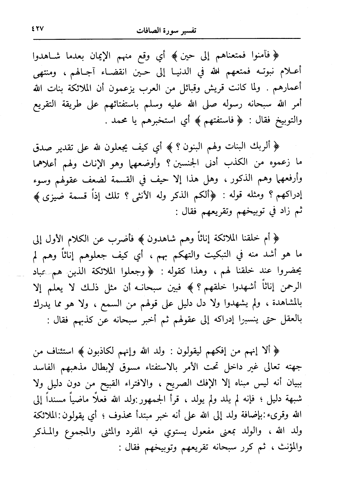 (فآمنوا فمتعناهم إلى حين) أي وقع منهم الإيمان بعدما شاهدوا أعلام نبوته فمتعهم الله في الدنيا إلى حين انقضاء آجالهم، ومنتهى أعمارهم. ولما كانت قريش وقبائل من العرب يزعمون أن الملائكة بنات الله أمر الله سبحانه رسوله صلى الله عليه وسلم باستفتائهم على طريقة التقريع والتوبيخ فقال: