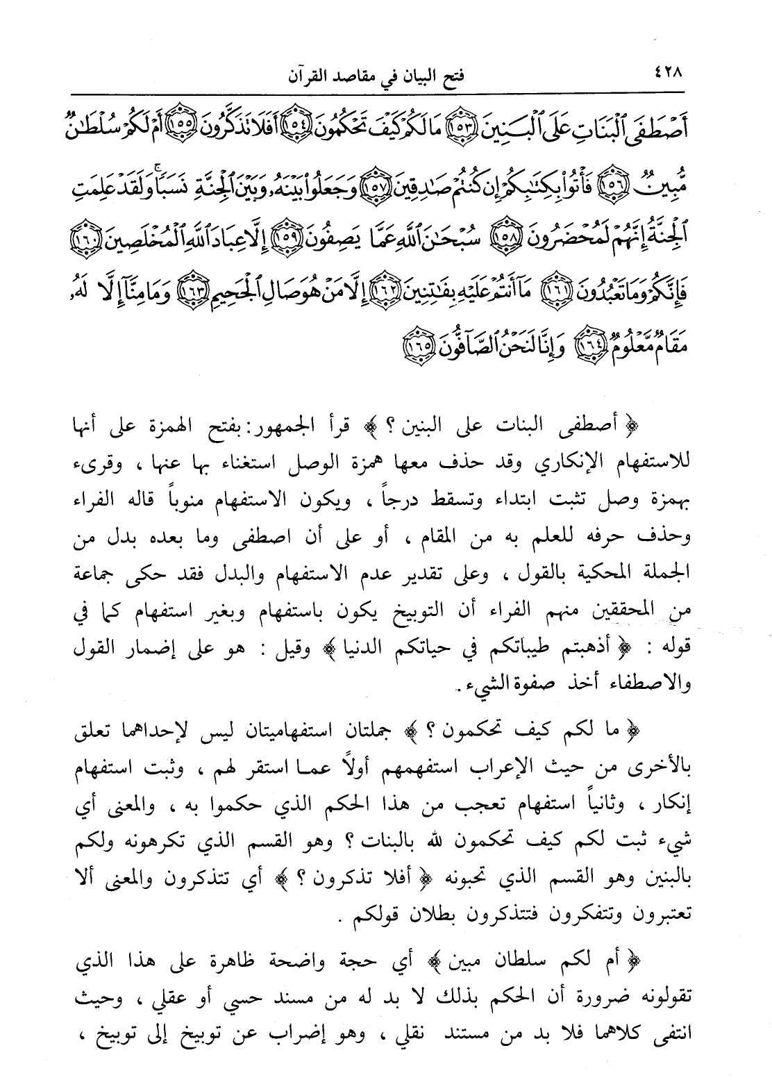 أَصْطَفَى الْبَنَاتِ عَلَى الْبَنِينَ (153) مَا لَكُمْ كَيْفَ تَحْكُمُونَ (154) أَفَلَا تَذَكَّرُونَ (155) أَمْ لَكُمْ سُلْطَانٌ مُبِينٌ (156) فَأْتُوا بِكِتَابِكُمْ إِنْ كُنْتُمْ صَادِقِينَ (157) وَجَعَلُوا بَيْنَهُ وَبَيْنَ الْجِنَّةِ نَسَبًا وَلَقَدْ عَلِمَتِ الْجِنَّةُ إِنَّهُمْ لَمُحْضَرُونَ (158) سُبْحَانَ اللَّهِ عَمَّا يَصِفُونَ (159) إِلَّا عِبَادَ اللَّهِ الْمُخْلَصِينَ (160) فَإِنَّكُمْ وَمَا تَعْبُدُونَ (161) مَا أَنْتُمْ عَلَيْهِ بِفَاتِنِينَ (162) إِلَّا مَنْ هُوَ صَالِ الْجَحِيمِ (163) وَمَا مِنَّا إِلَّا لَهُ مَقَامٌ مَعْلُومٌ (164) وَإِنَّا لَنَحْنُ الصَّافُّونَ (165)