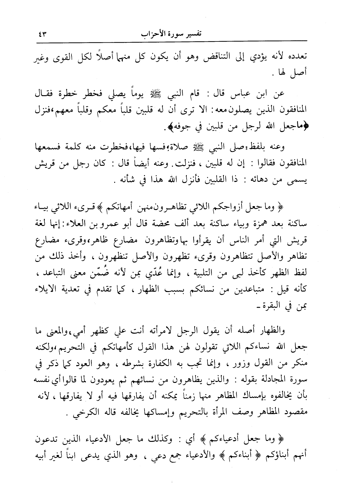 عن ابن عباس قال: قام النبي - صلى الله عليه وسلم - يوماً يصلي فخطر خطرة فقال المنافقون الذين يصلون معه: إلا ترى أن له قلبين قلباً معكم وقلباً معهم، فنزل (ما جعل الله لرجل من قلبين في جوفه).