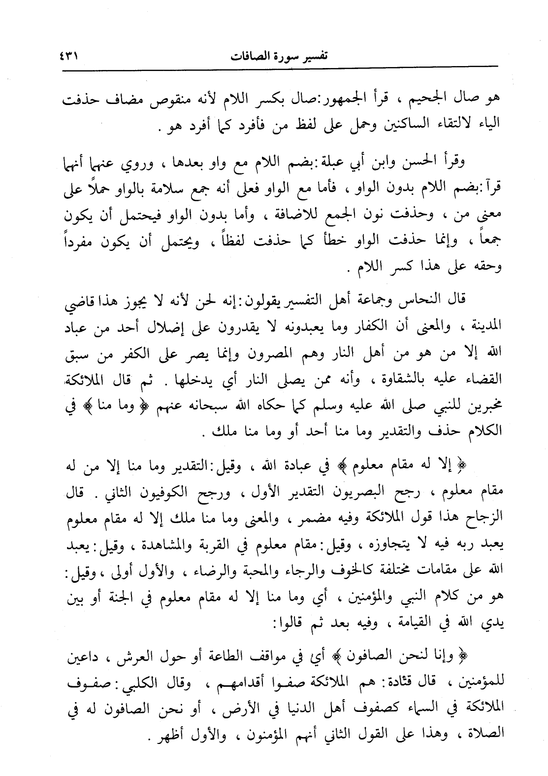 (إلا له مقام معلوم) في عبادة الله، وقيل: التقدير وما منا إلا من له مقام معلوم، رجح البصريون التقدير الأول، ورجح الكوفيون الثاني. قال الزجاح هذا قول الملائكة وفيه مضمر، والمعنى وما منا ملك إلا له مقام معلوم يعبد ربه فيه لا يتجاوزه، وقيل: مقام معلوم في القربة والمشاهدة، وقيل: يعبد الله على مقامات مختلفة كالخوف والرجاء والمحبة والرضاء، والأول أولى، وقيل: هو من كلام النبي والمؤمنين، أي وما منا إلا له مقام معلوم في الجنة أو بين يدي الله في القيامة، وفيه بعد ثم قالوا: