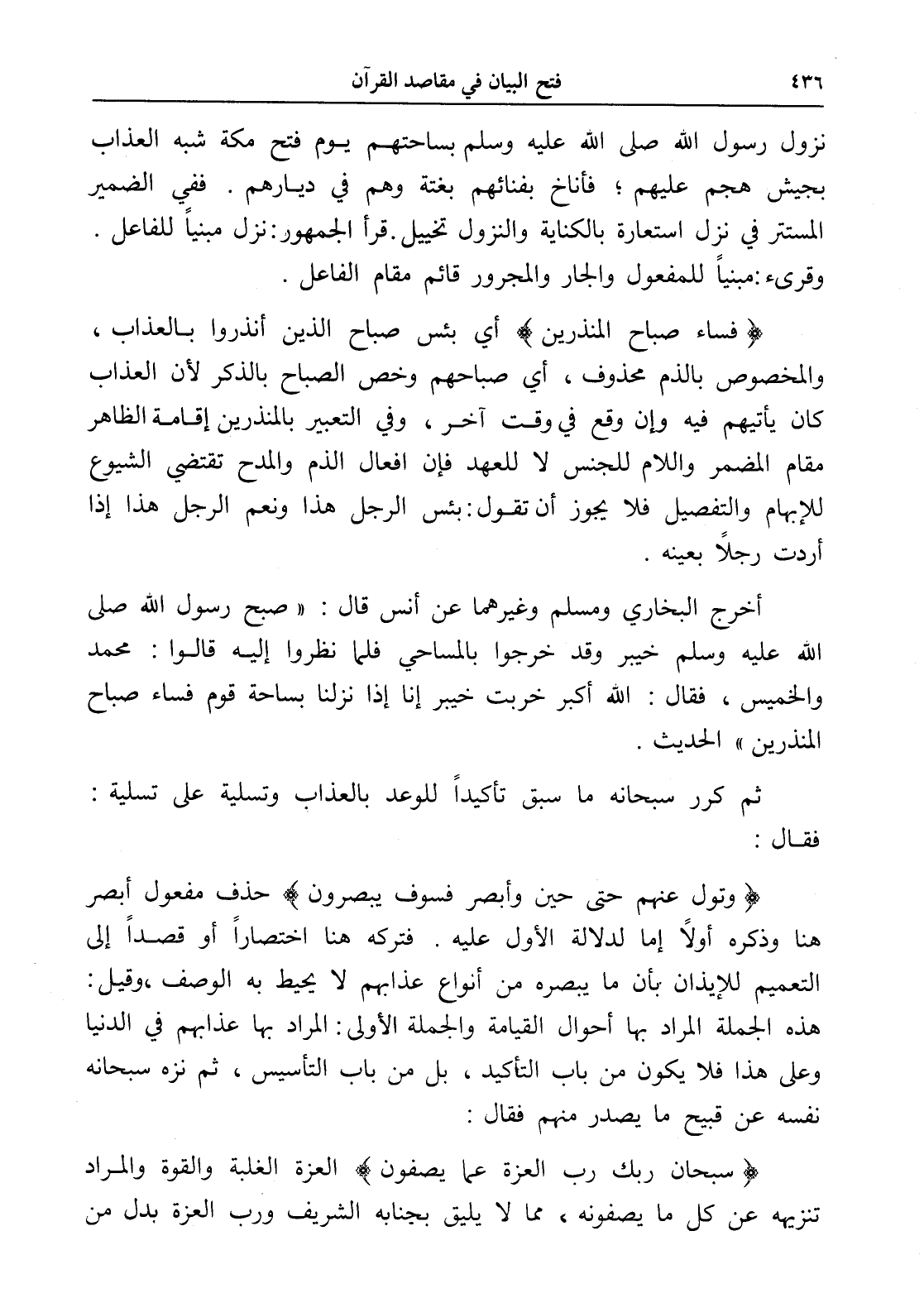 (فساء صباح المنذرين) أي بئس صباح الذين أنذروا بالعذاب، والمخصوص بالذم محذوف، أي صباحهم وخص الصباح بالذكر لأن العذاب كان يأتيهم فيه وإن وقع في وقت آخر، وفي التعبير بالمنذرين إقامة الظاهر مقام المضمر واللام للجنس لا للعهد فإن أفعال الذم والمدح تقتضي الشيوع للإبهام والتفصيل فلا يجوز أن تقول: بئس الرجل هذا ونعم الرجل هذا إذا أردت رجلاً بعينه.