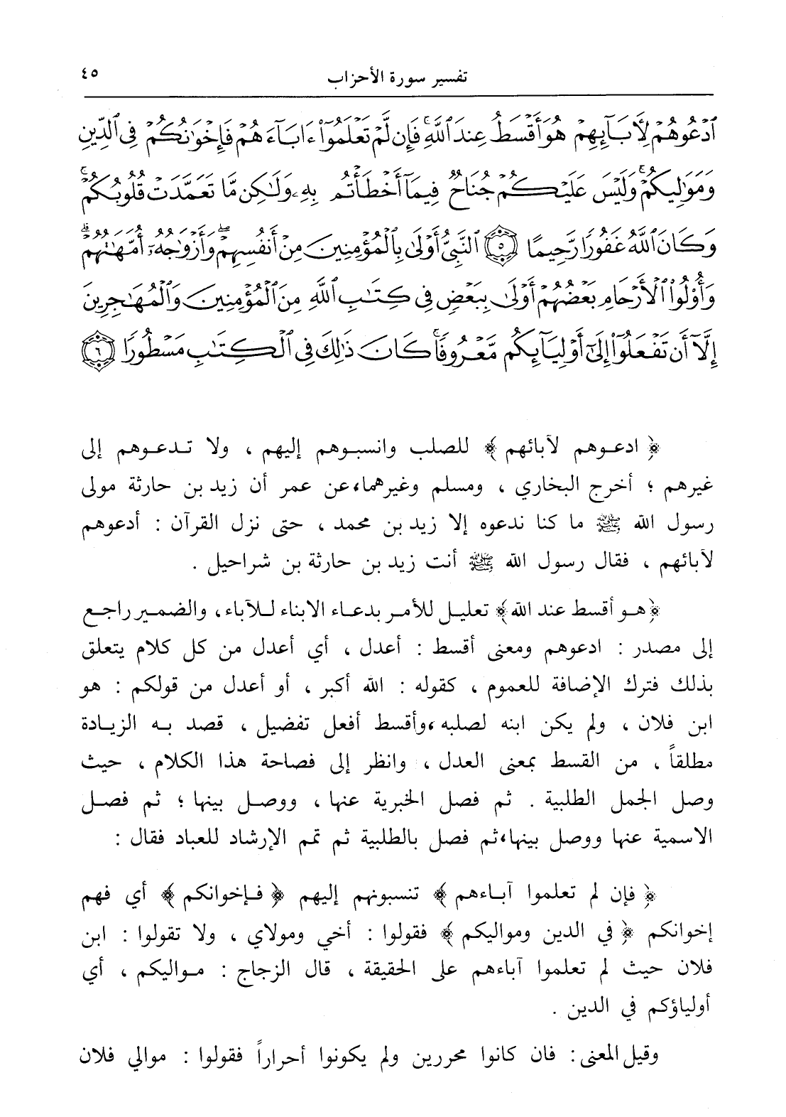 (ادْعُوهُمْ لِآبَائِهِمْ هُوَ أَقْسَطُ عِنْدَ اللَّهِ فَإِنْ لَمْ تَعْلَمُوا آبَاءَهُمْ فَإِخْوَانُكُمْ فِي الدِّينِ وَمَوَالِيكُمْ وَلَيْسَ عَلَيْكُمْ جُنَاحٌ فِيمَا أَخْطَأْتُمْ بِهِ وَلَكِنْ مَا تَعَمَّدَتْ قُلُوبُكُمْ وَكَانَ اللَّهُ غَفُوراً رَحِيماً (5) النَّبِيُّ أَوْلَى بِالْمُؤْمِنِينَ مِنْ أَنْفُسِهِمْ وَأَزْوَاجُهُ أُمَّهَاتُهُمْ وَأُولُو الْأَرْحَامِ بَعْضُهُمْ أَوْلَى بِبَعْضٍ فِي كِتَابِ اللَّهِ مِنَ الْمُؤْمِنِينَ وَالْمُهَاجِرِينَ إِلَّا أَنْ تَفْعَلُوا إِلَى أَوْلِيَائِكُمْ مَعْرُوفاً كَانَ ذَلِكَ فِي الْكِتَابِ مَسْطُوراً (6))