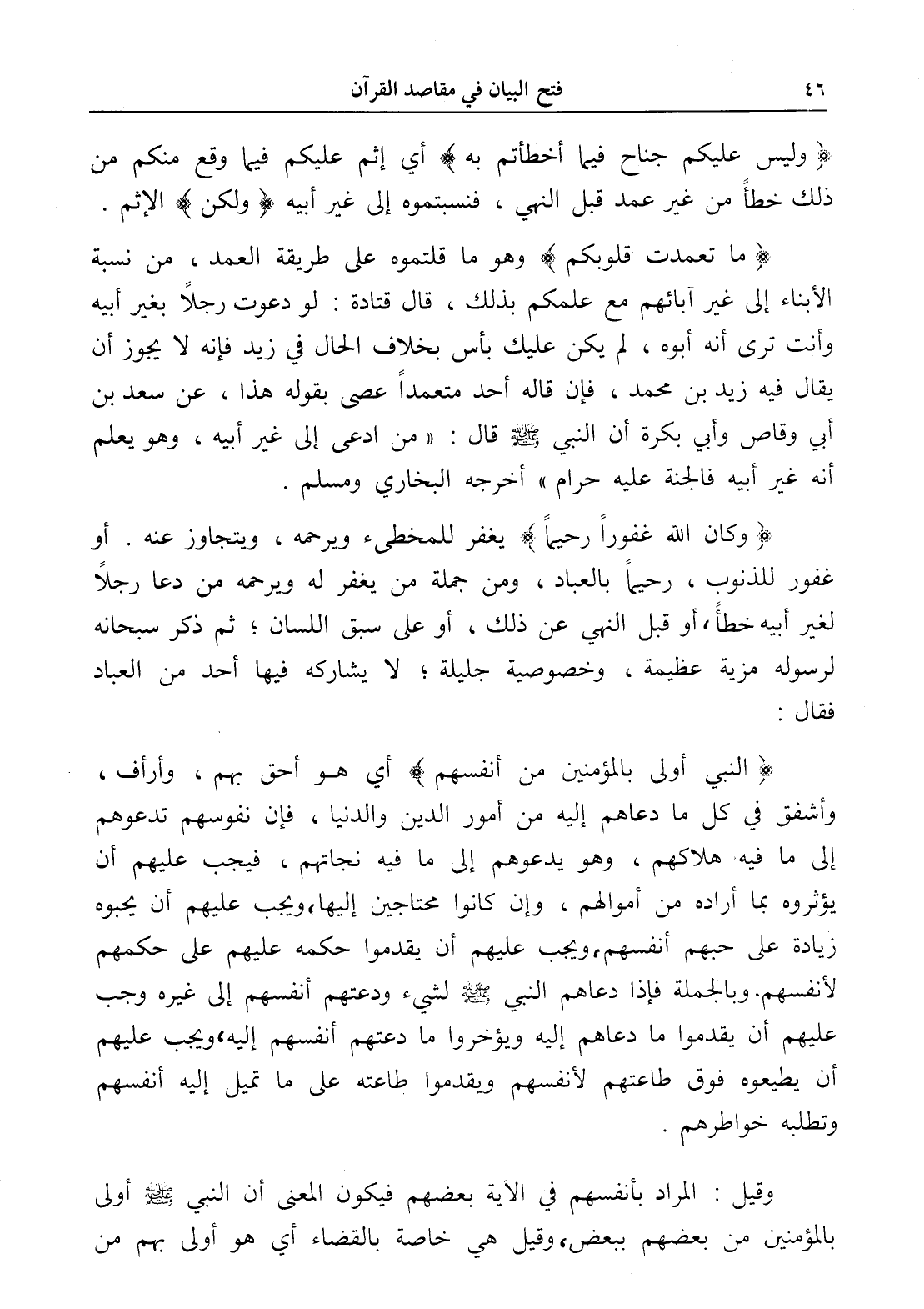 (وكان الله غفوراً رحيماً) يغفر للمخطىء ويرحمه، ويتجاوز عنه. أو غفور للذنوب، رحيماً بالعباد، ومن جملة من يغفر له ويرحمه من دعا رجلاً لغير أبيه خطأً، أو قبل النهي عن ذلك، أو على سبق اللسان؛ ثم ذكر سبحانه لرسوله مزية عظيمة، وخصوصية جليلة؛ لا يشاركه فيها أحد من العباد فقال: